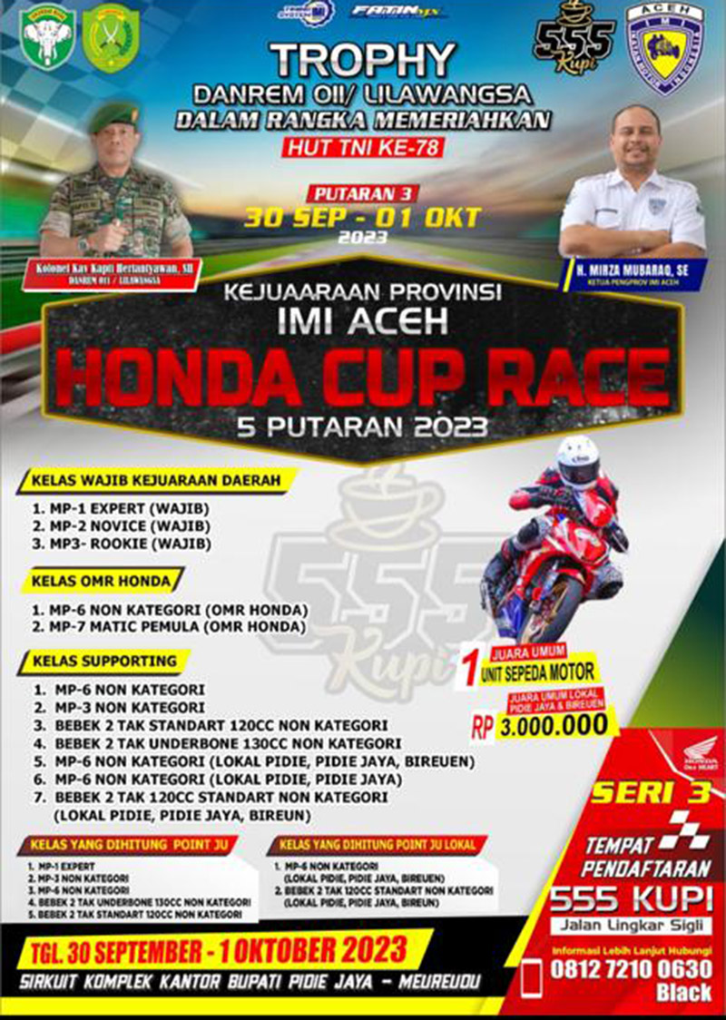 BalapMotor.Net – Agung Febri yang tergabung pada tim asal Kota Banda Aceh yaitu TR Racing FRT Loyalitas berhasil tampil apik pada ronde putaran kedua,Kejurprov IMI Aceh Honda Cup Race 2023 yang berlangsung di kota Meulaboh (9-10/9).