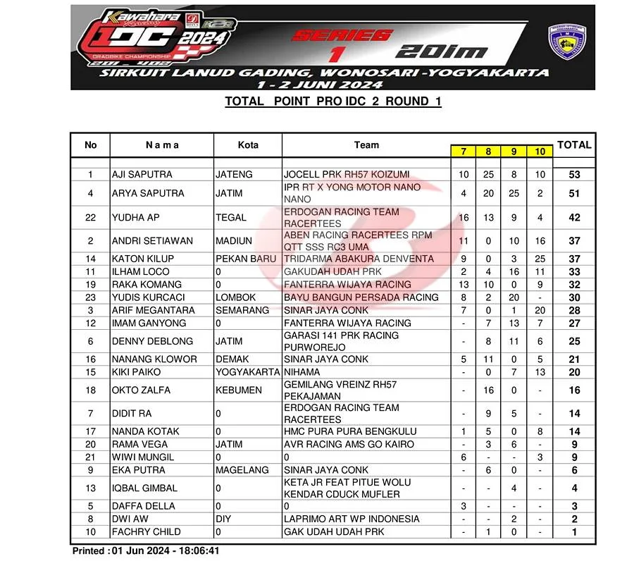 BalapMotor.Net – Aji Saputra dinobatkan sebagai juara umum kategori Pro IDC 2 putaran pertama Kawahara Djava K2R IDC Drag Bike Championship 2024 yang berlangsung di sirkuit NP. Lanud Gading, Wonosari (1-2 Juni).