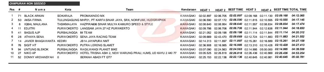 Dari total empat heat yang dipertandingkan, Dzaif konsisten mencatat waktu yang bagus. Secara keseluruhan ia unggul 5 detik dari Aksa Farma asal Tulungagung.