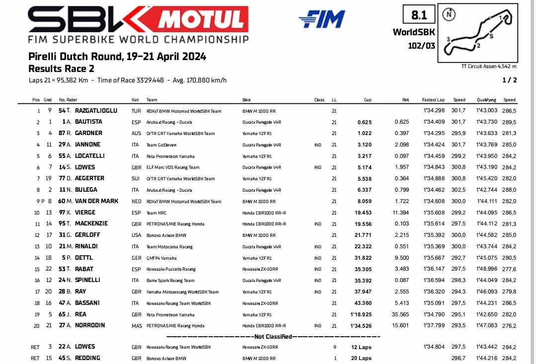 Podium juara yang ia raih pada Race 2 itu sangat mamuaskan bagi Toprak Razgatlioglu dan juga pabrikan Jerman. Menjadikan kemenangan perdananya di Assen setelah berkiprah lama di WSBK.