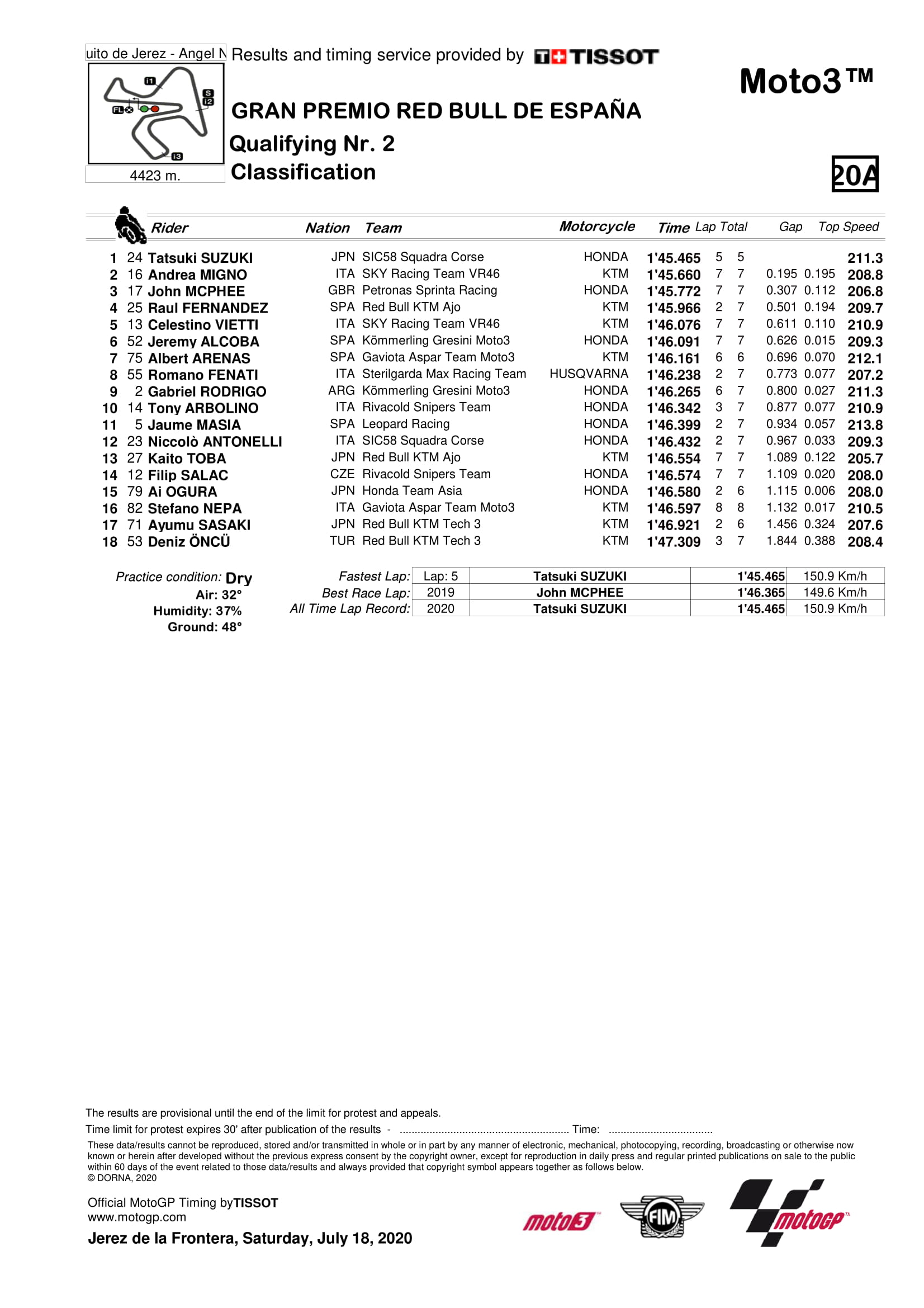 Suzuki yang membela tim SIC58 Squadra Corse mampu mencetak best time 1 menit 45,465 detik di sirkuit sepanjang 4423 meter ini. Pembalap yang sudah 5 musim bertarung full series di Moto3 ini mengungguli Andrea Migno dari SKY Racing Team VR46.