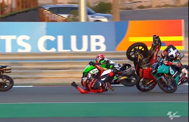 Jeremy Alcoba menabrak bagian belakang Darryn Binder dan terjatuh, namun motornya mengenai John McPhee sehingga dia juga ikut tersungkur. Namun reaksi pembalap asal Skotlandia tersebut begitu berlebihan.