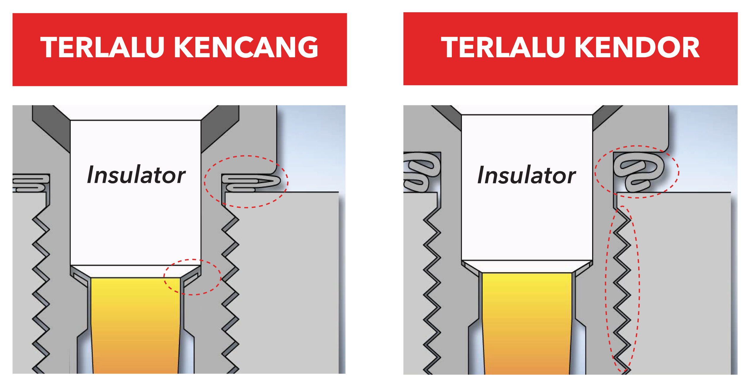 Sebagai contoh, apabila memasang busi terlalu kencang dapat mengakibatkan ulir busi rusak yang tentunya akan mengakibatkan busi nantinya akan sulit untuk dilepas kembali. Bagian center electrode hingga terminal nut pun tidak luput dari resiko kerusakan apabila kita tidak memasang busi dengan tingkat kekencangan yang tepat sehingga akan mempengaruhi fungsi busi hingga performa mesin kendaraan.