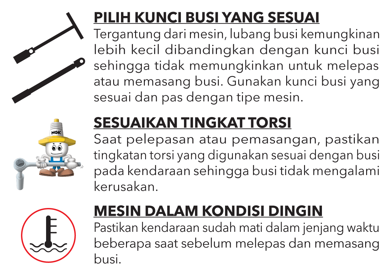 Yang terakhir adalah, pastikan mesin kendaraan sudah berada pada kondisi mati dalam jenjang waktu beberapa saat sebelum melepas dan memasang busi agar sifat logam pada busi maupun kepala silinder sudah stabil sehingga tidak memicu adanya kerusakan pada kedua komponen tersebut.