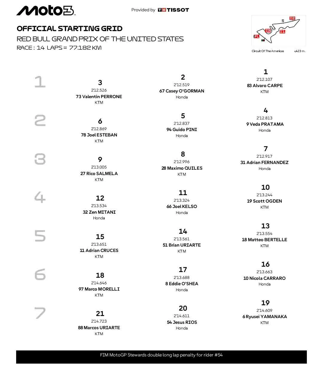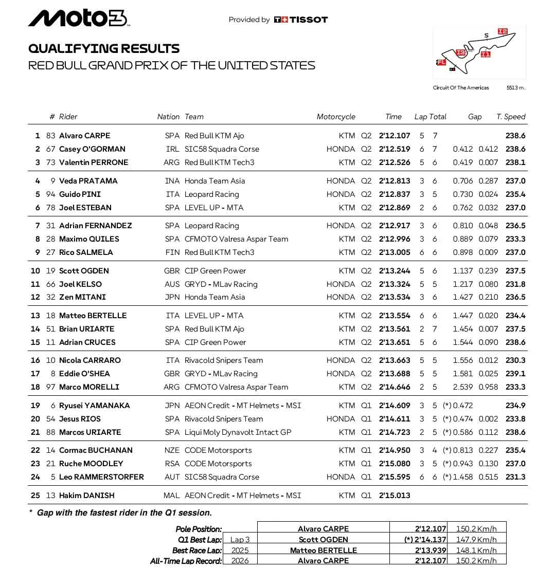 BalapMotor.Net – Veda Ega Pratama kembali on fire. Pembalap asal Gunung Kidul itu menorehkan catatan manis pada sesi kualifikasi Moto3 Amerika yang tersaji di sirkuit COTA.