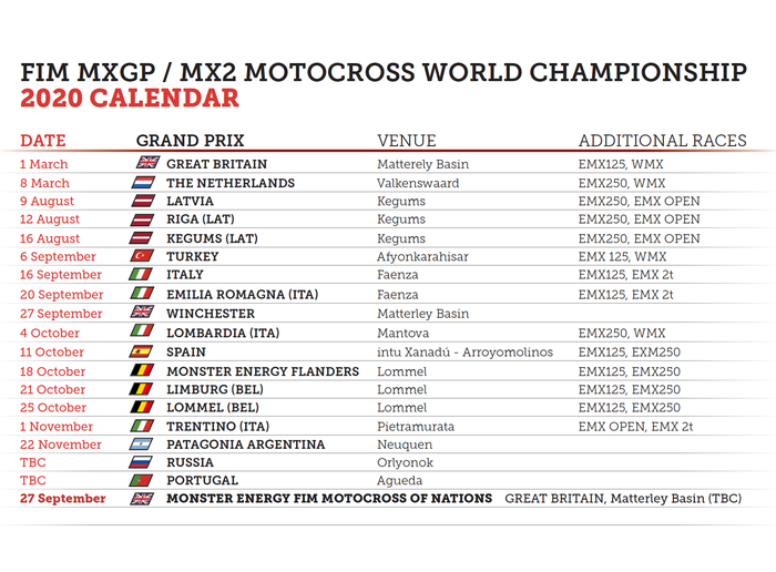Faktanya, MXGP di musim 2020 hanya akan memainkan balapan yang ada di benua Eropa dan satu seri di Argentina. Dimulai dari Latvia pada 9 Agustus, dan diakhiri dengan seri penutup di Inggris pada 27 September yang bertakjub MXGP Motocross Of Nation.