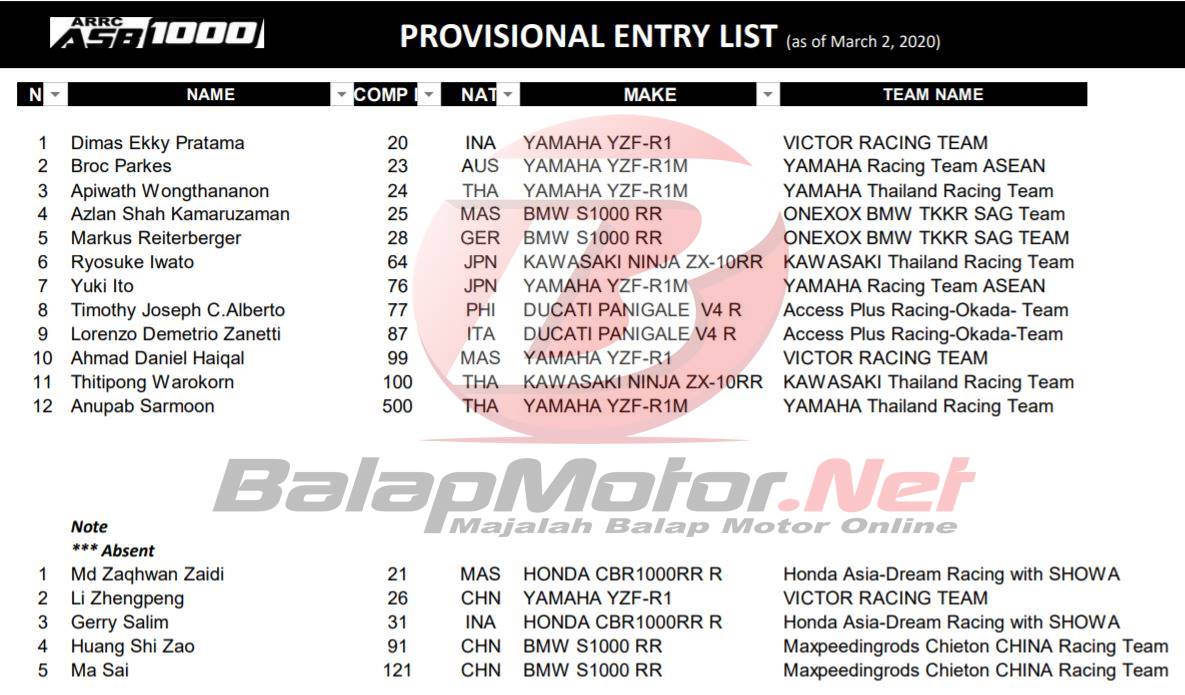 Jadi, jumlah starter untuk kelas ASB1000 dipastikan berkurang pada gelaran perdana akhir pekan ini. Selain itu, dari data entrylist kemarin (2/2) ada tiga pembalap selain dari tim Maxpeedingrods Chieton China Racing yang juga absen.