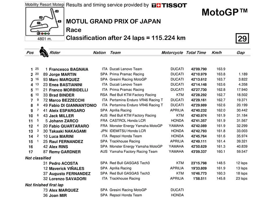 Di Grand Prix Jepang ini juga menjadi catatan special bagi pembalap Italia itu. Dimana ini merupakan pertama kalinya Bagnaia memenangi delapan balapan dalam satu musim MotoGP. Konsistensi bisa menjadi kunci gelar juara dunia ketiganya.