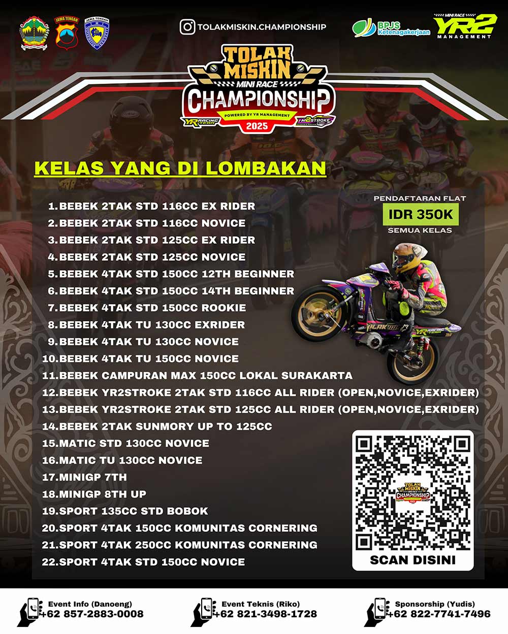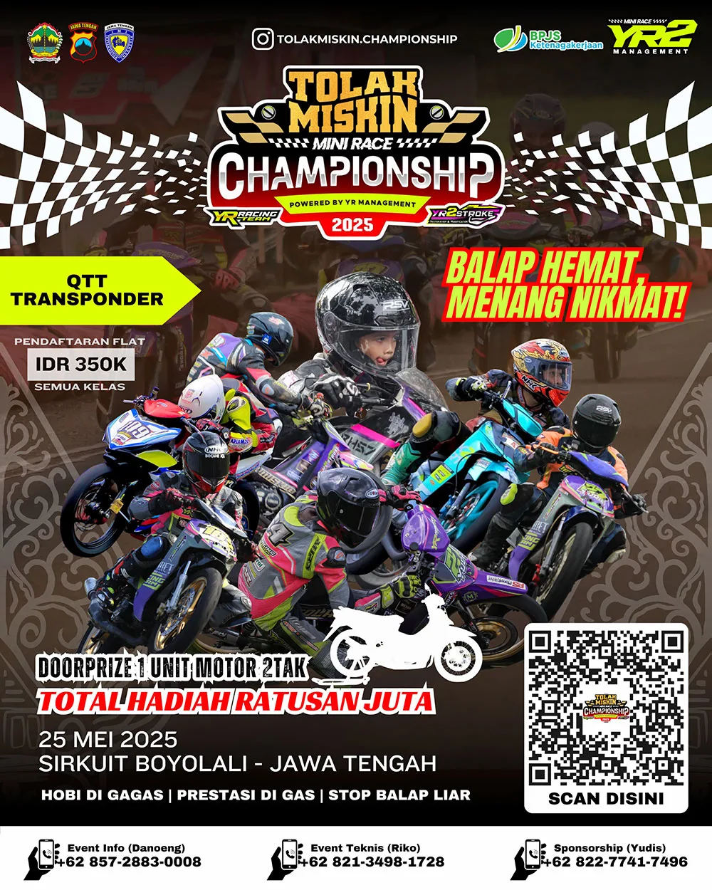 Dengan tagline unik “Balap Hemat, Menang Nikmat!”, event ini menjadi angin segar bagi para rider pemula yang ingin menjajal atmosfer balap yang serius namun tetap ramah di kantong. Tak main-main, gelaran ini diprakarsai oleh YR Management dan menggandeng Tolak Miskin sebagai sponsor utama.