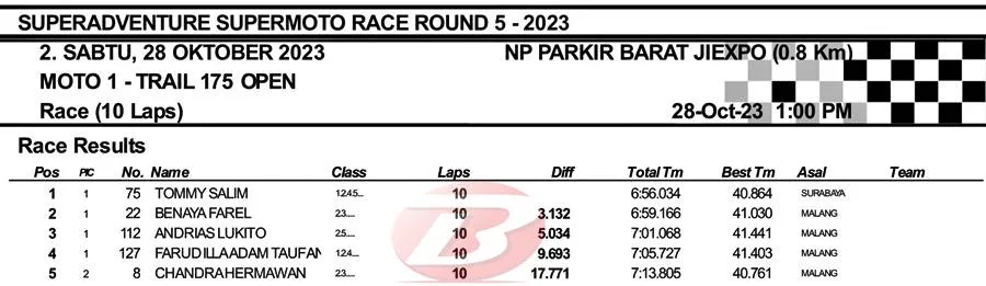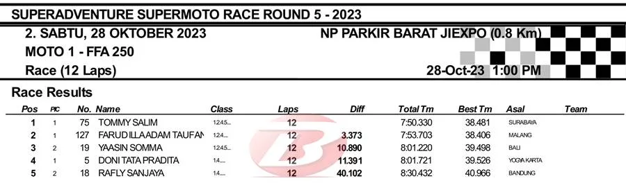 BalapMotor.Net – Setelah tampil luar biasa pada saat sesi kualifikasi, Tommy Salim juga melanjutkan tren apiknya pada Moto1 Final Superadventure Supermoto Race yang berlangsung di sirkuit NP. Jiexpo Kemayoran (28/10).