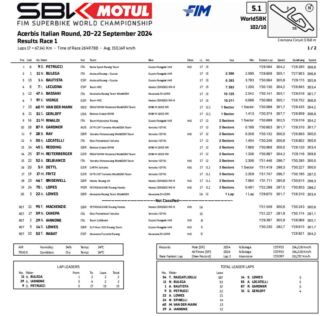 “Saya tidak dapat mempercayainya, tetapi ketika saya melepas helm, saya dapat mengatakan bahwa saya menang di MotoGP, Dakar, dan sekarang kembali ke balap jalan raya dan menang di World Superbike,” kata Petrucci.