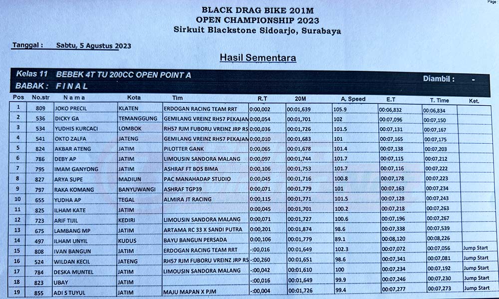 BalapMotor.Net – Joko Precil, joki asal Klaten yang kali ini membela tim Erdogan Racing Team RRT berhasil menjadi yang terbaik pada kelas Bebek 4T TU 200cc Open Point A Black Drag Bike Sidoarjo, 5 Agustus 2023.