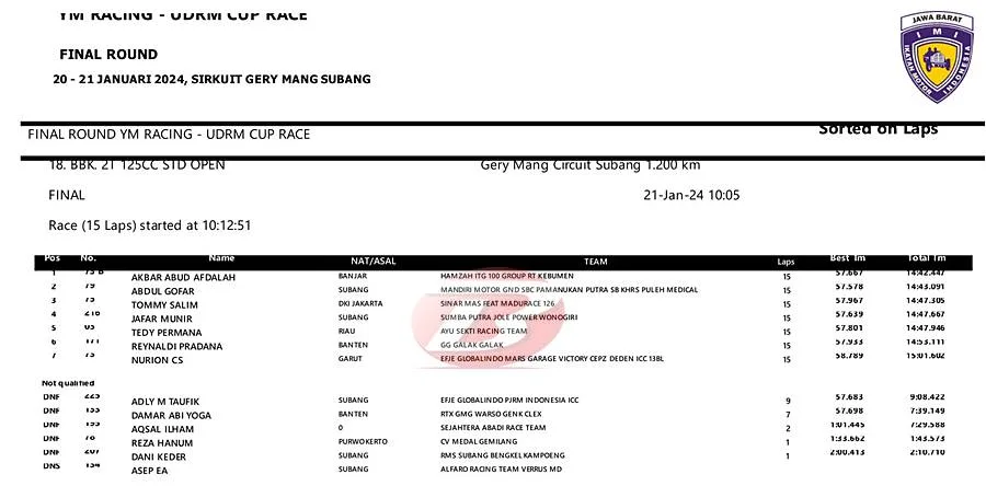 BalapMotor.Net – Pertempuran kelas special Bebek 2T STD 125cc pada kejuaraan UDRM Cup Race yang berlangsung di sirkuit Gery Mang, Subang, Jawa Barat tersaji dengan seru dan menarik.