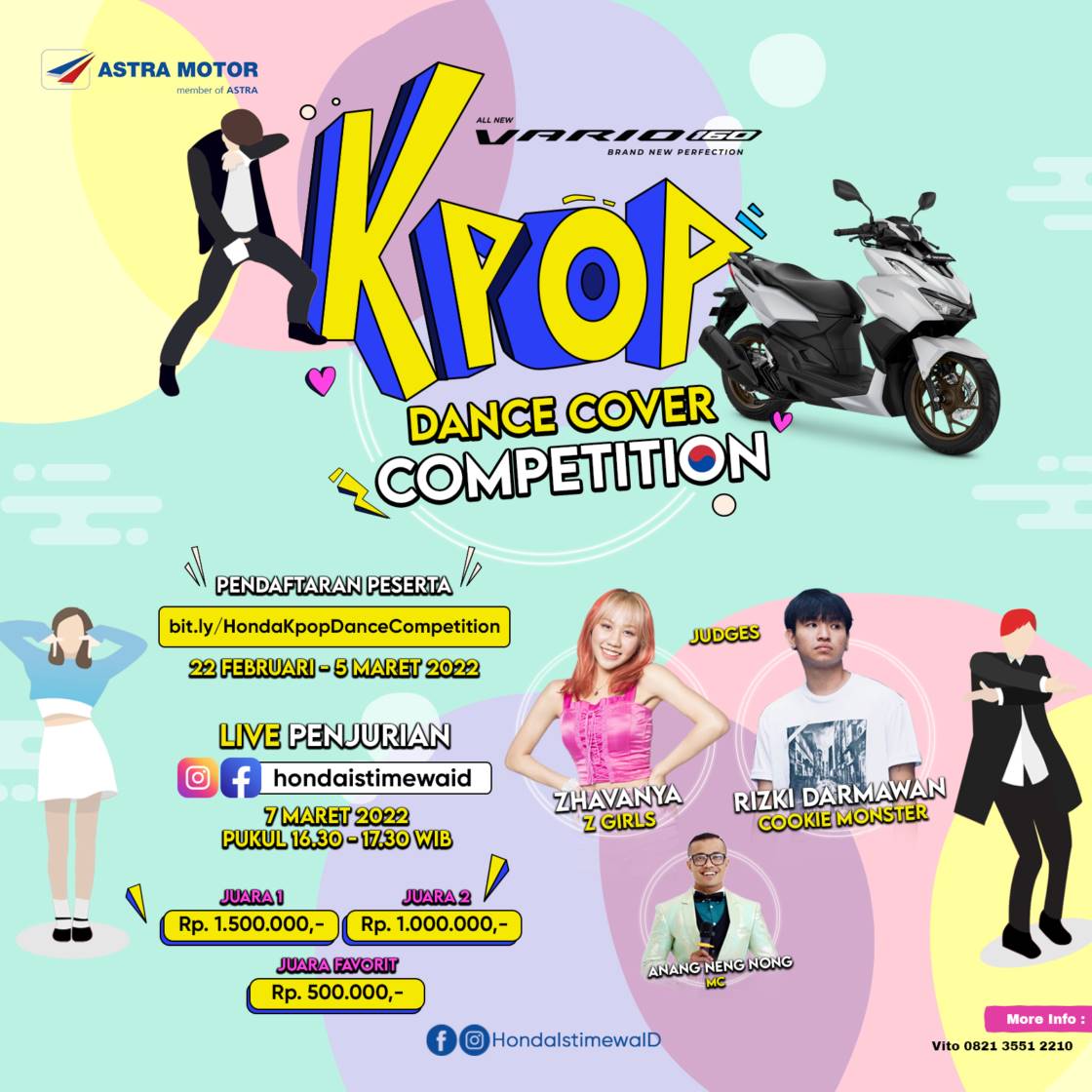 Menghadirkan apresiasi kepada pecinta KPOP Dance Cover, Astra Motor Yogyakarta melalui akun Instagram @HondaIstimewaID kembali menghadirkan All New Honda Vario 160 KPOP Dance Cover Competition dengan periode upload video hingga 5 Maret 2022.