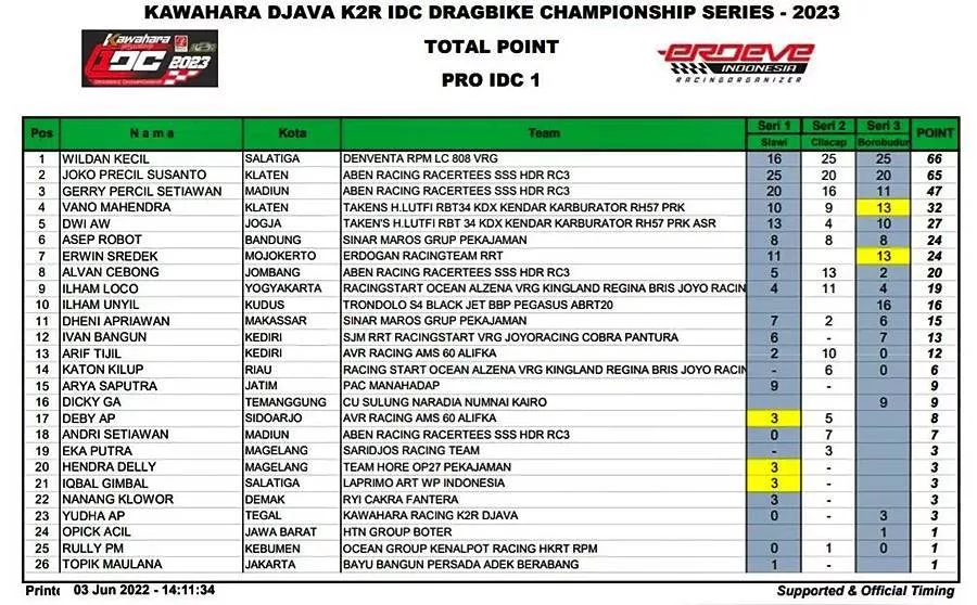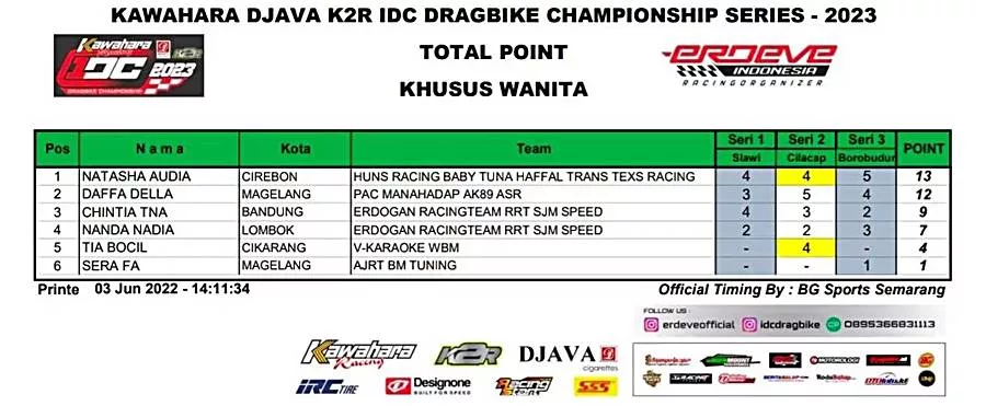 BalapMotor.Net – Berikut merupakan data klasemen sementara kategori poin di kejuaraan Kawahara Djava K2R IDC Drag Bike 2023 setelah menyelesaikan tiga putaran di Slawi, Cilacap dan juga Magelang. (***)
