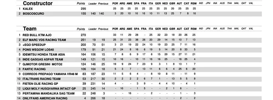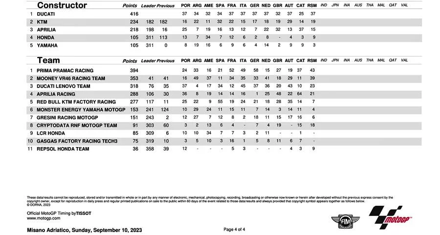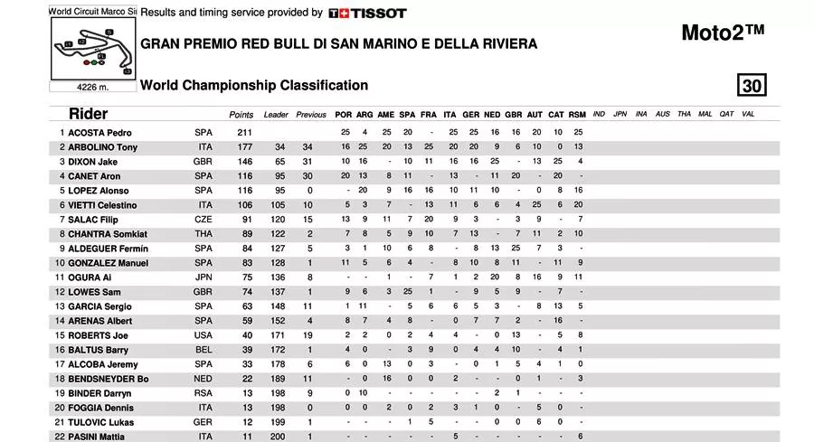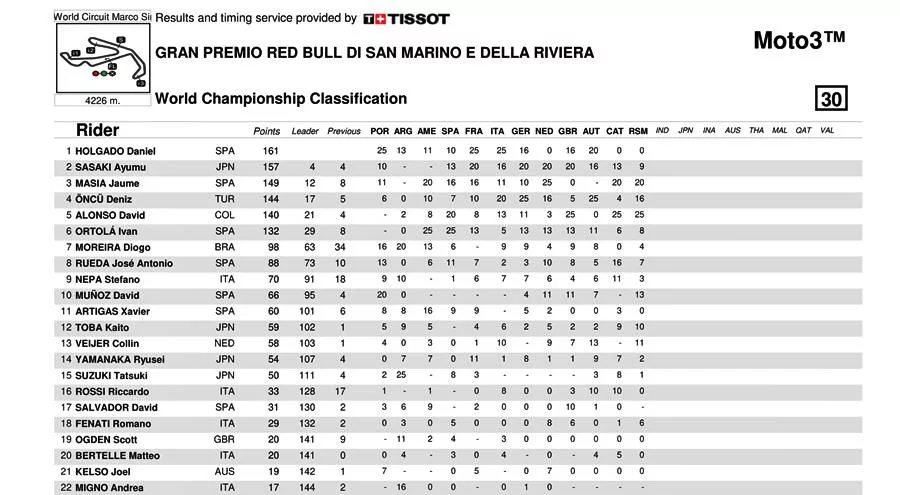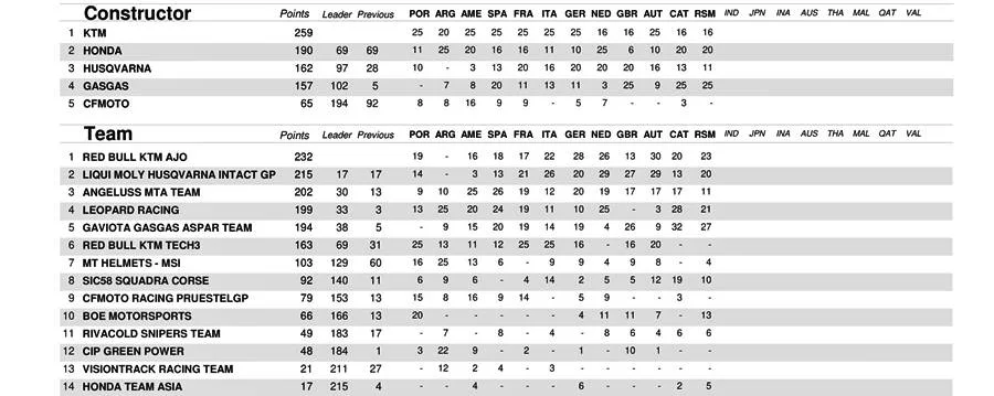 BalapMotor.Net – Berikut merupakan data klasemen poin sementara kejuaraan dunia Moto3, Moto2 dan MotoGP setelah menyelesaikan Grand Prix San Marino yang berlangsung di Misano World Circuit Marco Simonchelli pada 9-10 September 2023. (***)