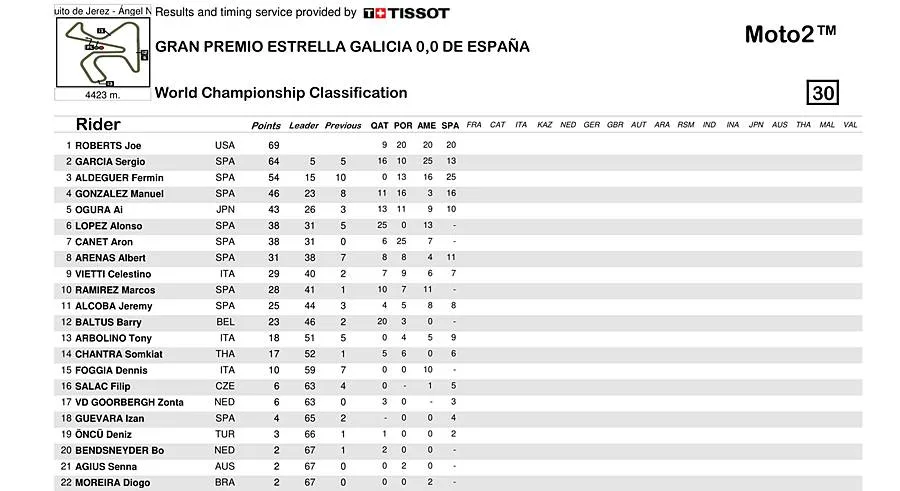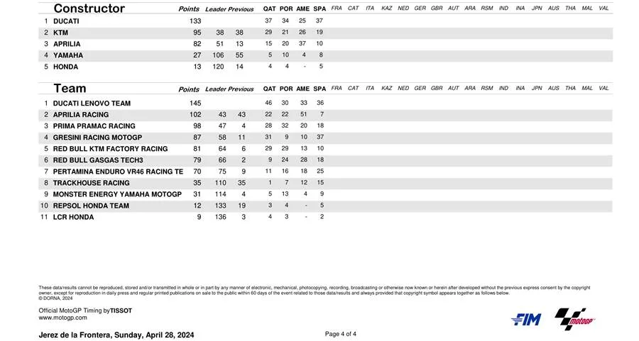 BalapMotor.Net – Berikut merupakan klasemen terbaru kejuaraan dunia MotoGP, Moto2 dan Moto3 setelah putaran keempat yang berlangsung di sirkuit Jerez, Spanyol pada 27-28 April 2024. (***)