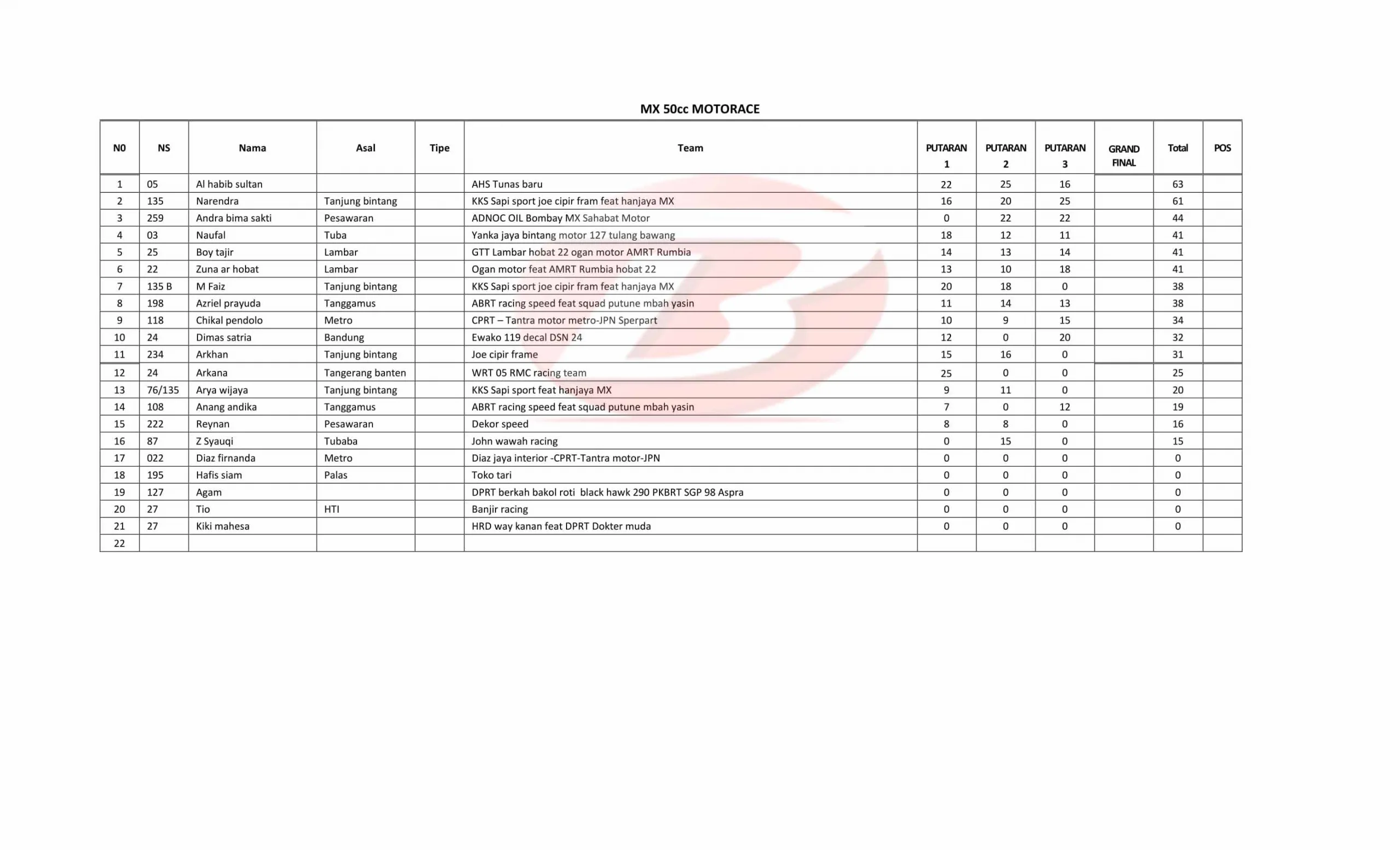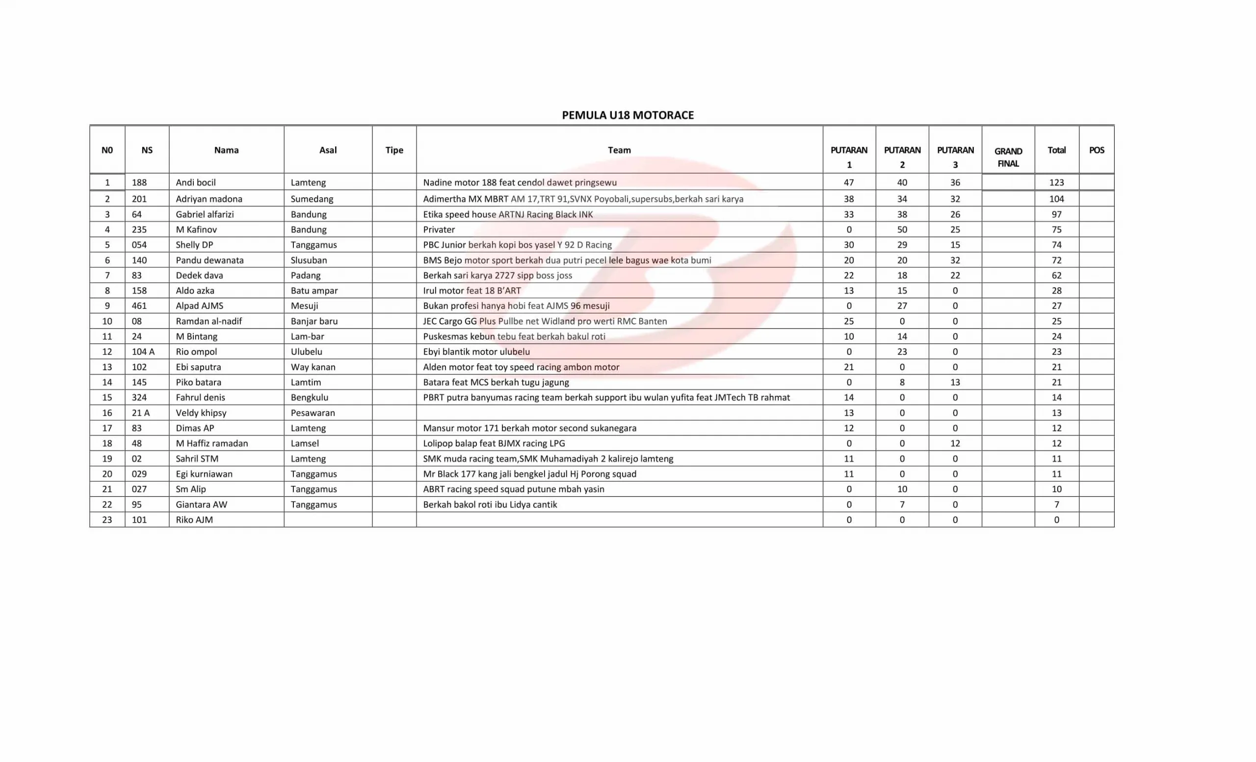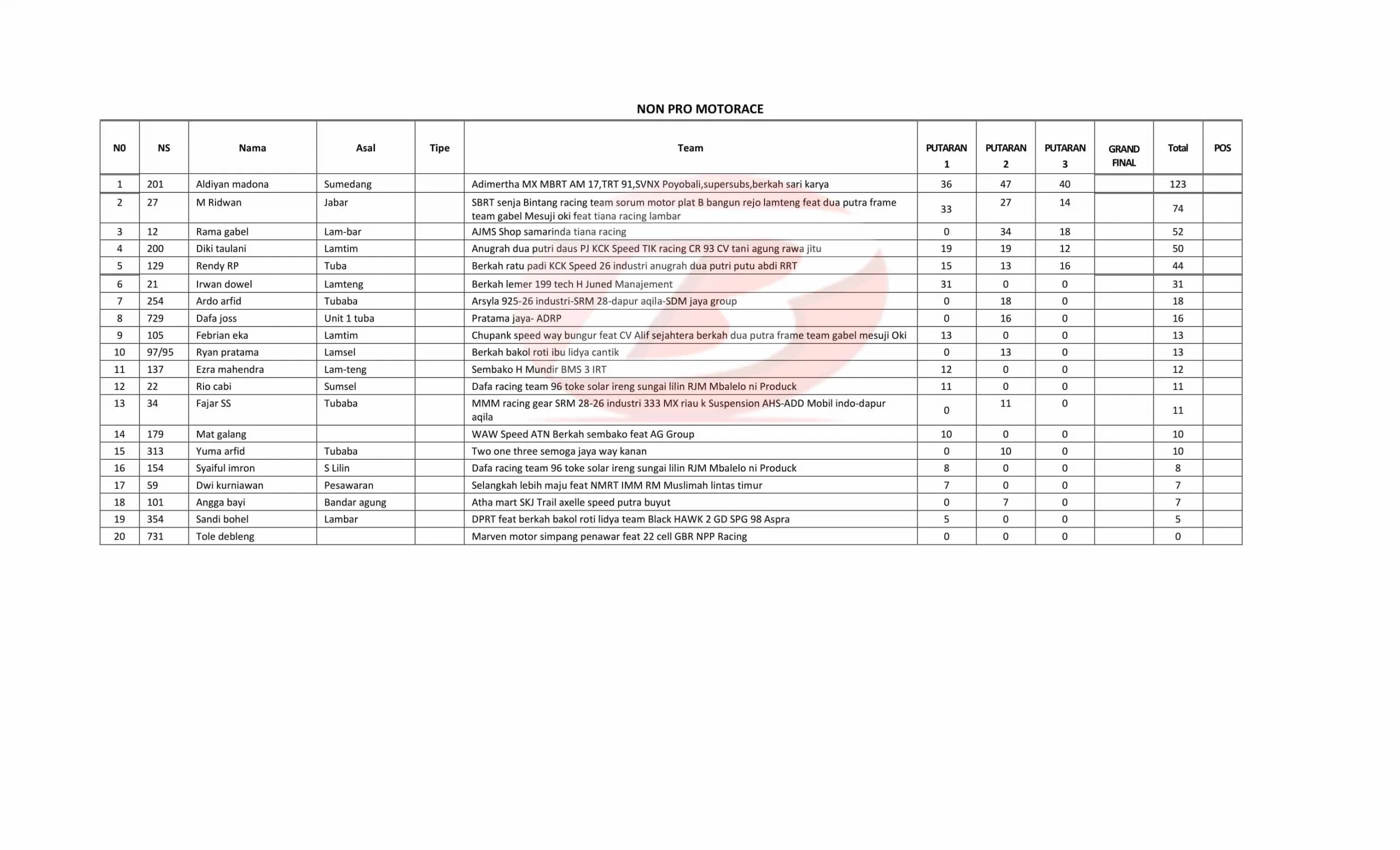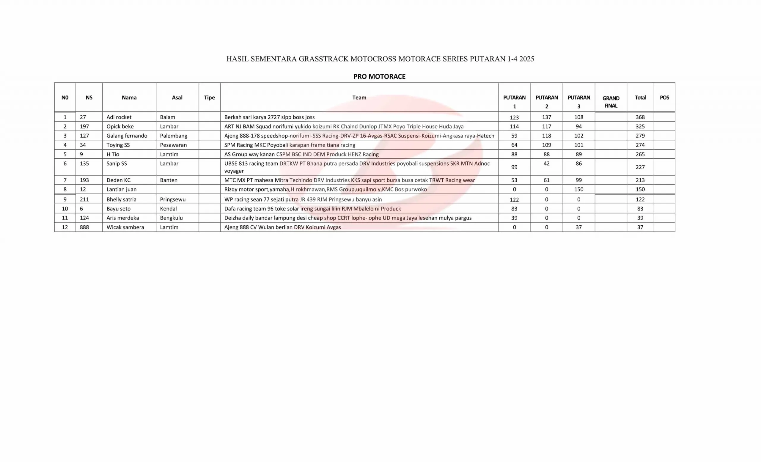 BalapMotor.Net – Berikut merupakan data standing point sementara Kejuaraan Motorace Series Grasstrack & Motocross Championship 2025 setelah menyelesaikan 4 putaran. (**)