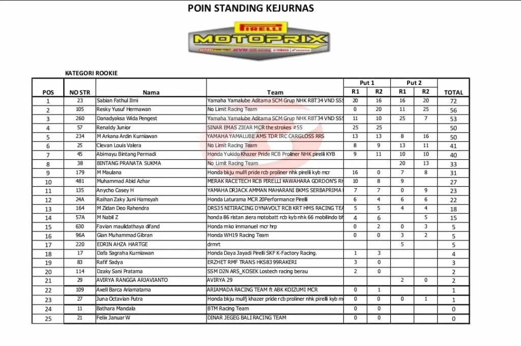 BalapMotor.Net – Berikut merupakan standing point sementara Kejuaraan Nasional Motoprix Region B setelah menyelesaikan dua putaran yang berlangsung di sirkuit GBT Surabaya dan sirkuit Boyolali, Jawa Tengah.