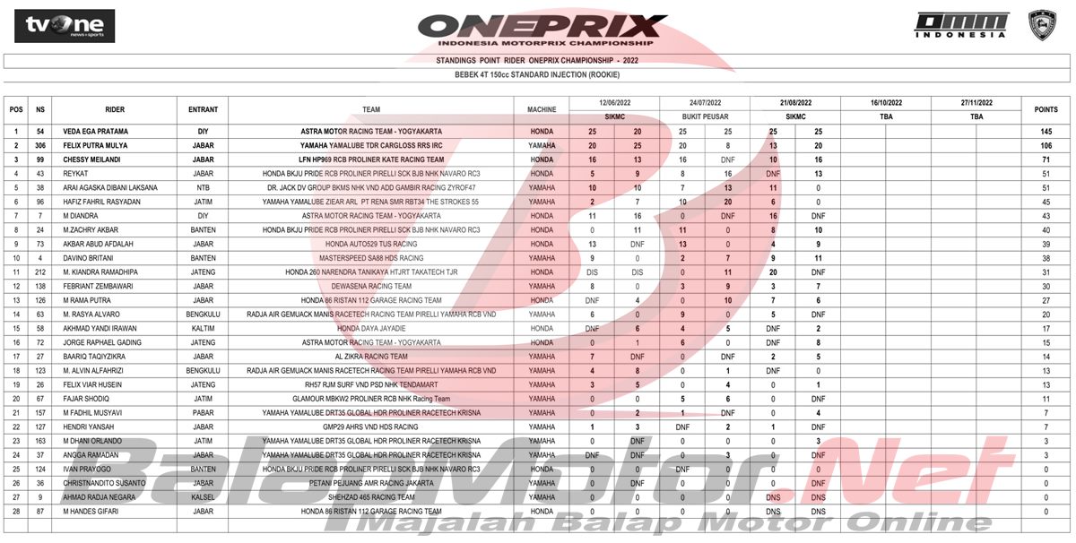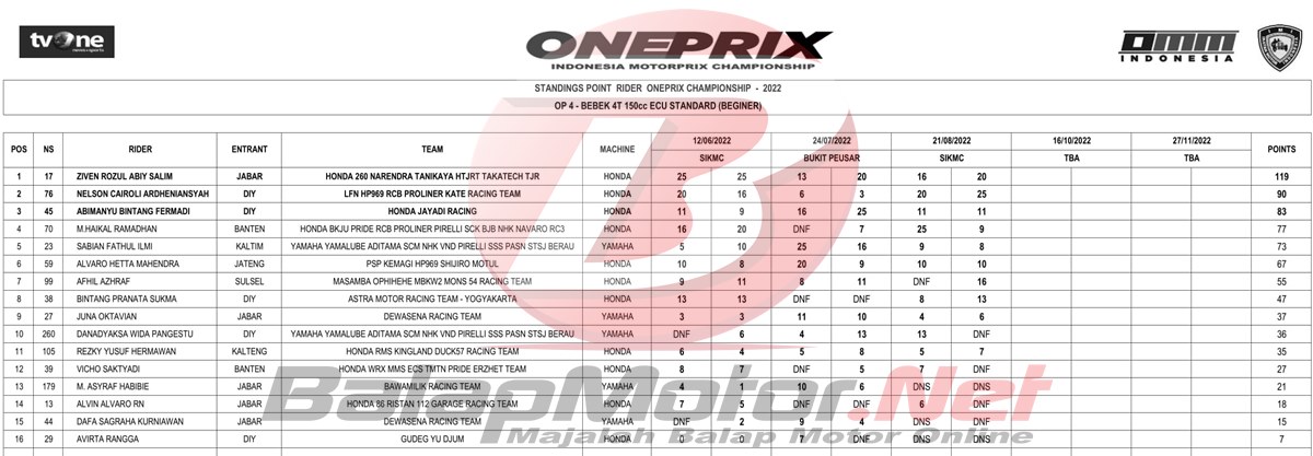 BalapMotor.Net – Berikut merupakan update klasemen sementara kelas Kejurnas untuk gelaran Oneprix Championship 2022 setelah melewati ronde ketiga di sirkuit Sentul Karting, Bogor akhir pekan lalu.