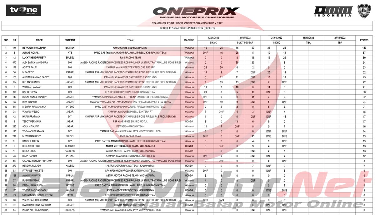 Reynaldi Pradana dari GMP29 AHRS VND HDS Racing memimpin klasemen di kelas Expert dengan perbedaan poin cukup lumayan dengan Aldiaz Aqsal PARD Casytha Manahadap Rajawali Pirelli KYB RT.