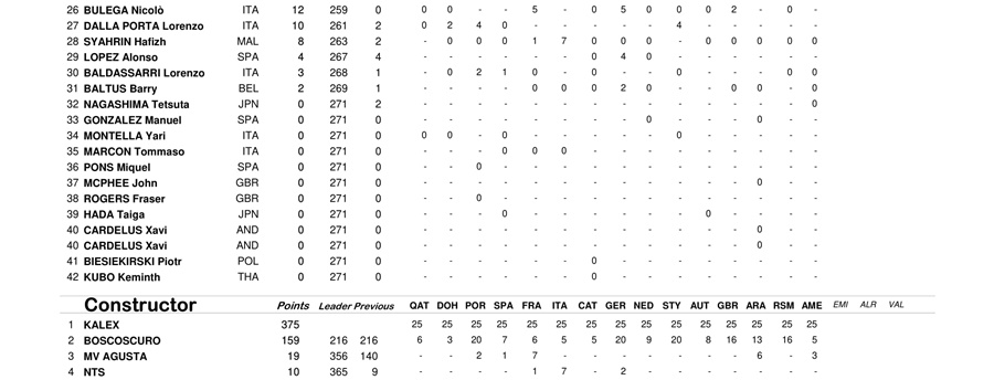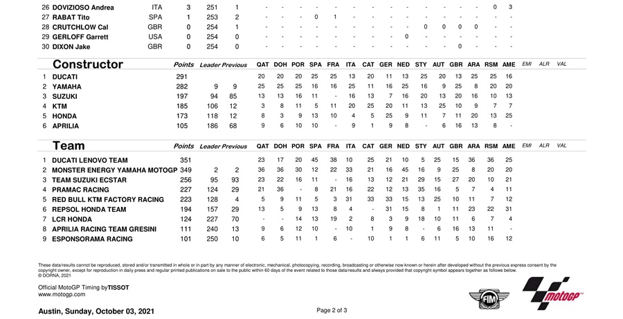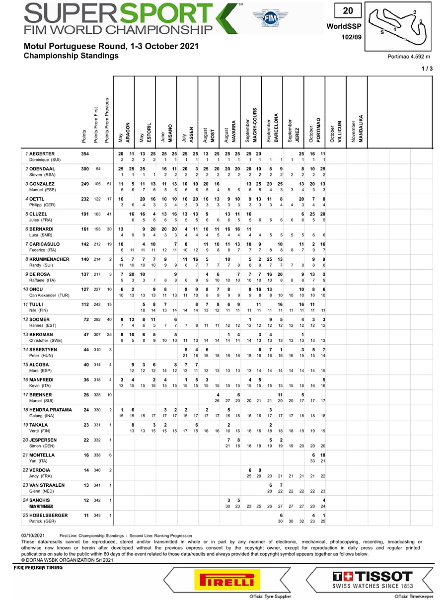BalapMotor.Net – Berikut kami paparkan klasemen sementara dari Kejuaraan Dunia MotoGP, Moto2 dan Moto3 setelah putaran Amerika serta WorldSBK, WorldSSP dan WorldSSP300cc yang telah berlangsung di Portimao pada 1-3 Oktober 2021.