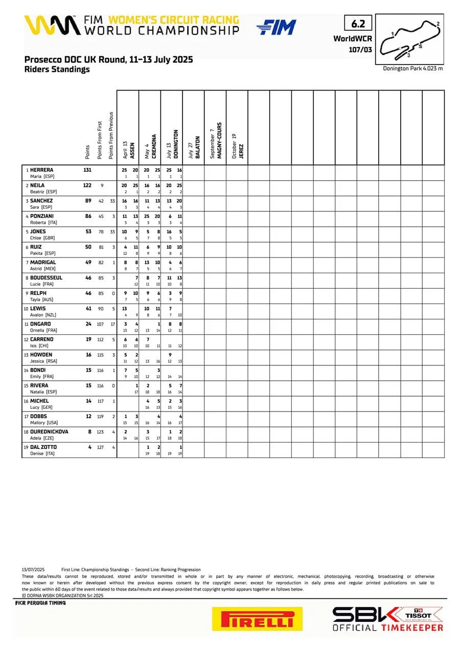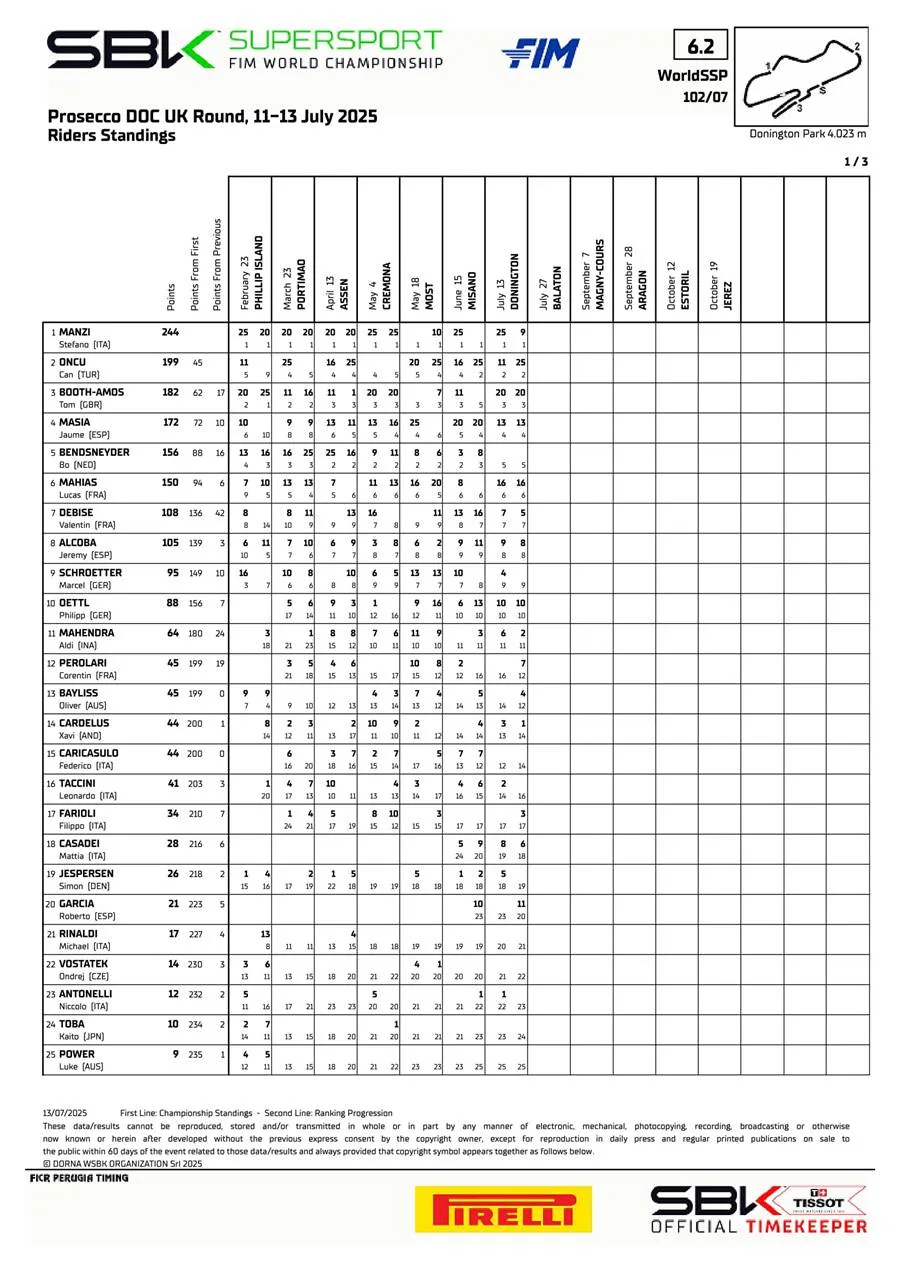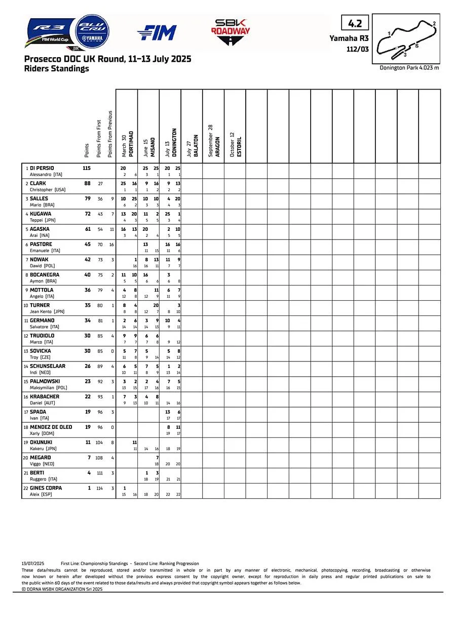 BalapMotor.Net – Berikut merupakan standing point sementara Kejuaraan Dunia Superbike dan Supersport serta R3 bLU cRU World Cup setelah menyelesaikan putaran ketujuh di sirkuit Donington Park, Inggris pada 12-13 Juli 2025. (**)