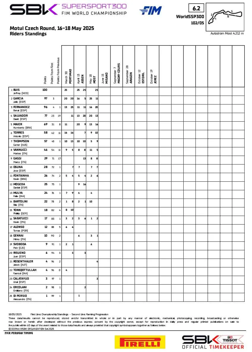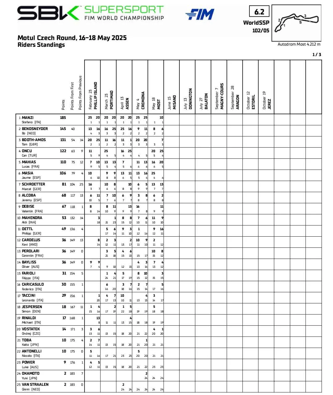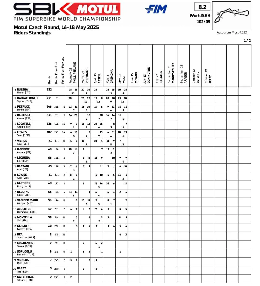 BalapMotor.Net – Berikut merupakan data klasemen sementara Kejuaraan Dunia Superbike dan Supersport setelah putaran Ceko yang berlangsung di sirkuit Autodrom Most pada 16-18 Mei 2025. (**)