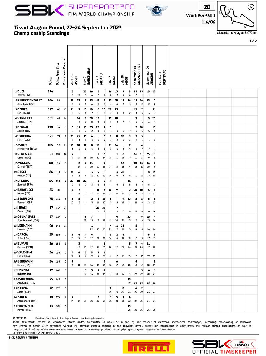 BalapMotor.Net – Berikut merupakan data poin klasemen sementara kejuaraan dunia superbike, supersport dan supersport300cc setelah menyelesaikan balapan di sirkuit MotorLand Aragon, Spanyol pada 24 September 2023. (***)