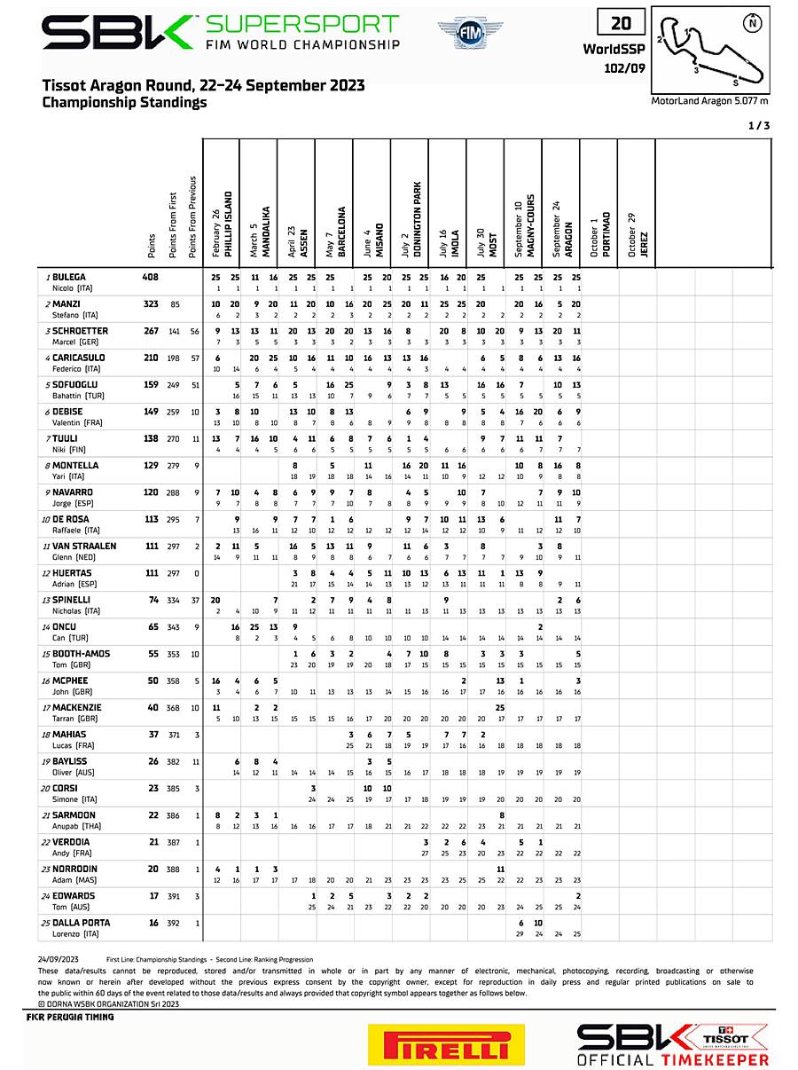 BalapMotor.Net – Berikut merupakan data poin klasemen sementara kejuaraan dunia superbike, supersport dan supersport300cc setelah menyelesaikan balapan di sirkuit MotorLand Aragon, Spanyol pada 24 September 2023. (***)