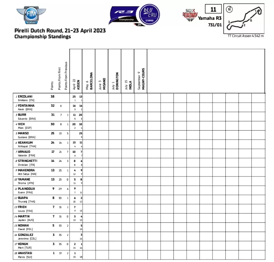 BalapMotor.Net – Berikut merupakan klasemen terbaru kejuaraan dunia superbike, supersport dan supersport 300 setelah putaran ketiga yang berlangsung di Circuit TT Assen, Belanda pada 22-23 April 2023. (***)
