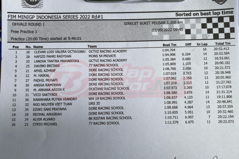 “Pada FP1 Valera belum bisa cetak time terbaik karena sering terhalang pembalap lainnya, padahal saat latihan bisa 1 menit 02 detikan,” ungkap Bima Octavianus ayah dari Valera saat dihubungi penulis. “Saya optimis bisa jadi juara om,” semangat Valera Octavianus.