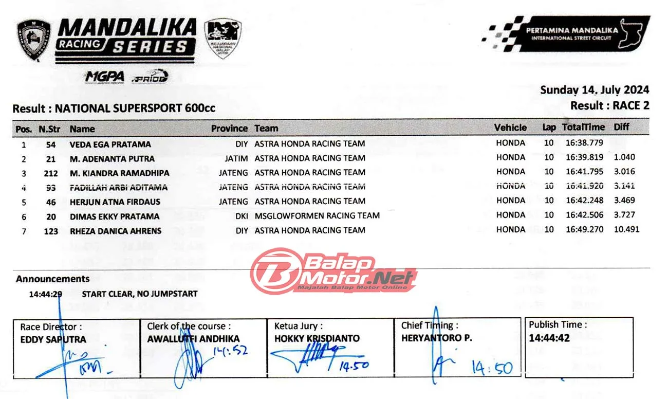 BalapMotor.Net – Veda Ega Pratama berhasil memenangkan jalannya race 2 kelas National Supersport 600cc ronde 3 Mandalika Racing Series (MRS) 2024 yang berlangsung di sirkuit Mandalika 14 Juli 2024.