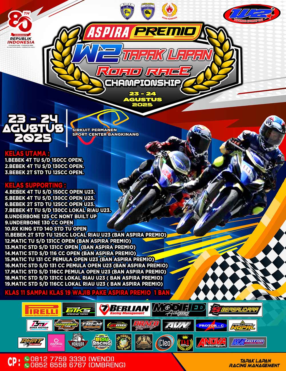 BalapMotor.Net – Setelah absen menggelar event balap sejak tahun 2022, W2 Tapak Lapan akhirnya kembali menghidupkan atmosfer balap di Riau dengan menggelar Aspira Premio W2 Tapak Lapan Road Race Championship. Event ini akan berlangsung pada tanggal 23-24 Agustus 2025 di Sirkuit Permanen Sport Center Bangkinang, Riau.