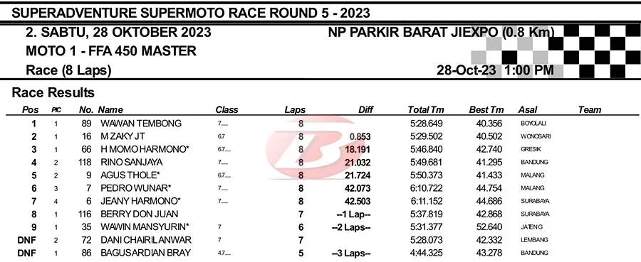 BalapMotor.Net – Dua pembalap Jawa Tengah tampil menawan pada jalannya Moto1 kategori Master. Ada Wawan Tembonk dan M Zaky. Tembonk yang juga freestyler top ini menjadi yang terbaik di kelas FFA 450 Master.