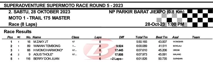 Sementara M Zaky yang merupakan juragan trail asal Wonogiri berhasil mengamankan podium juara Moto1 Trail 175 Master. Penampilan keduanya di trek legendaris Kemayoran ini memang terbukti cukup dominan.