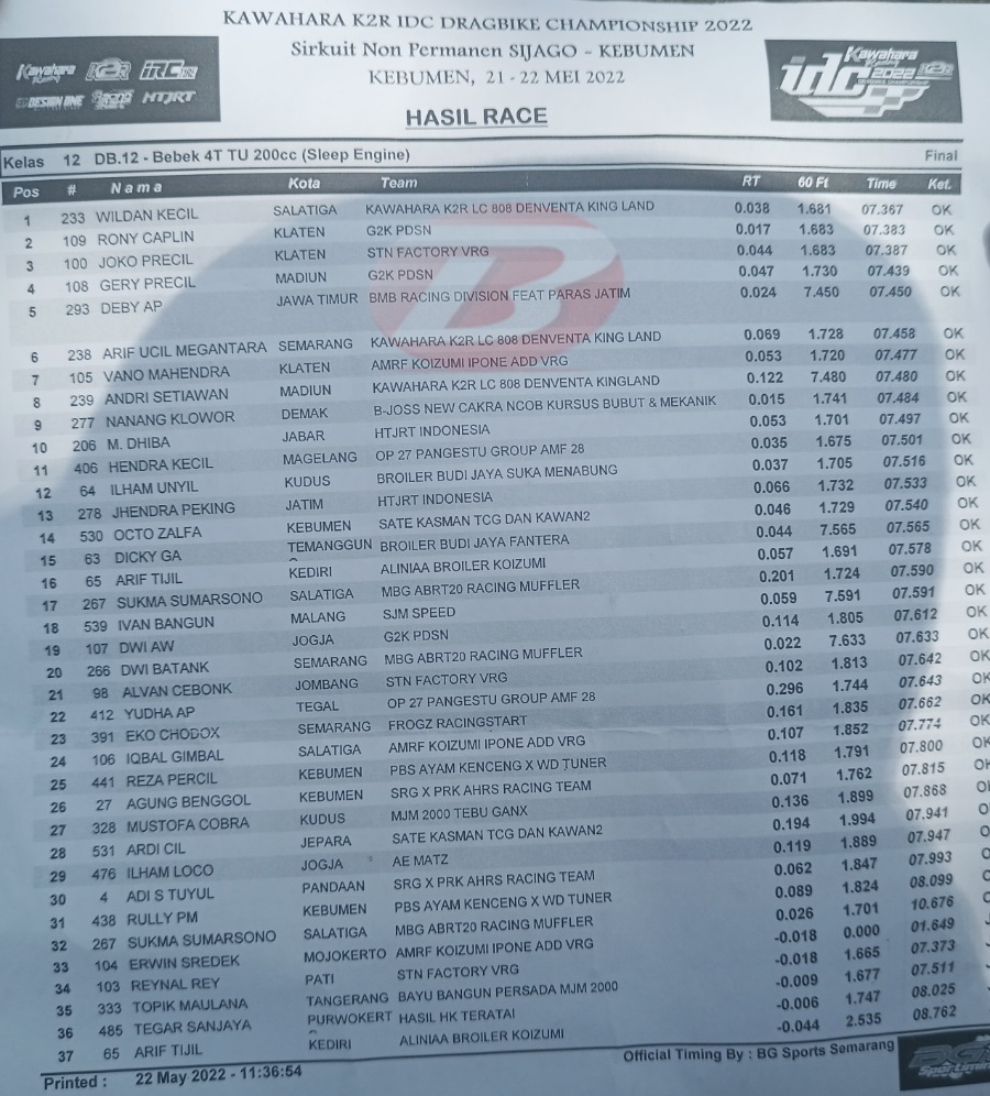 “Alhamdulillah kak bisa memberikan hasil terbaik lagi di kelas ini,” bangga Wildan Kecil, Dragster asal Salatiga yang mencatat waktu 7,3 67 detik. Sementara itu podium kedua kali ini ditempati oleh Rony Caplin, diikuti oleh Joko Precil, Gery Precil dan Deby AP.