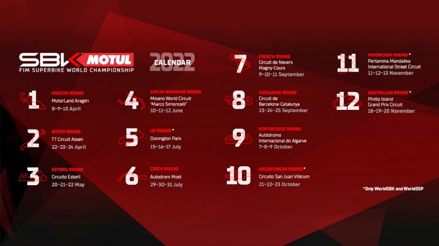BalapMotor.Net – Kejuaraan Dunia Superbike telah merilis kalender sementara musim 2022. Kali ini, 12 seri telah menemukan titik terang untuk lokasi yang akan digunakan oleh Jonathan Rea dan kawan-kawan.
