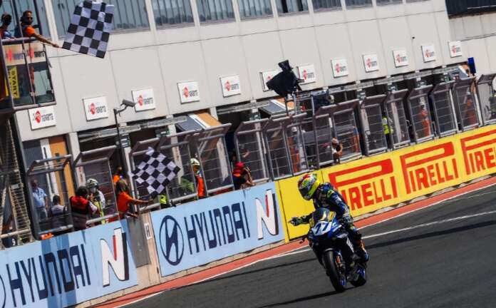 Kali ini pemimpin Kejuaraan Dominique Aegerter mengamankan kemenangan sensasional untuk ketujuh kalinya musim ini setelah sukses dalam pertempuran dengan rival Championship Steven Odendaal (Evan Bros. WorldSSP Yamaha Team).