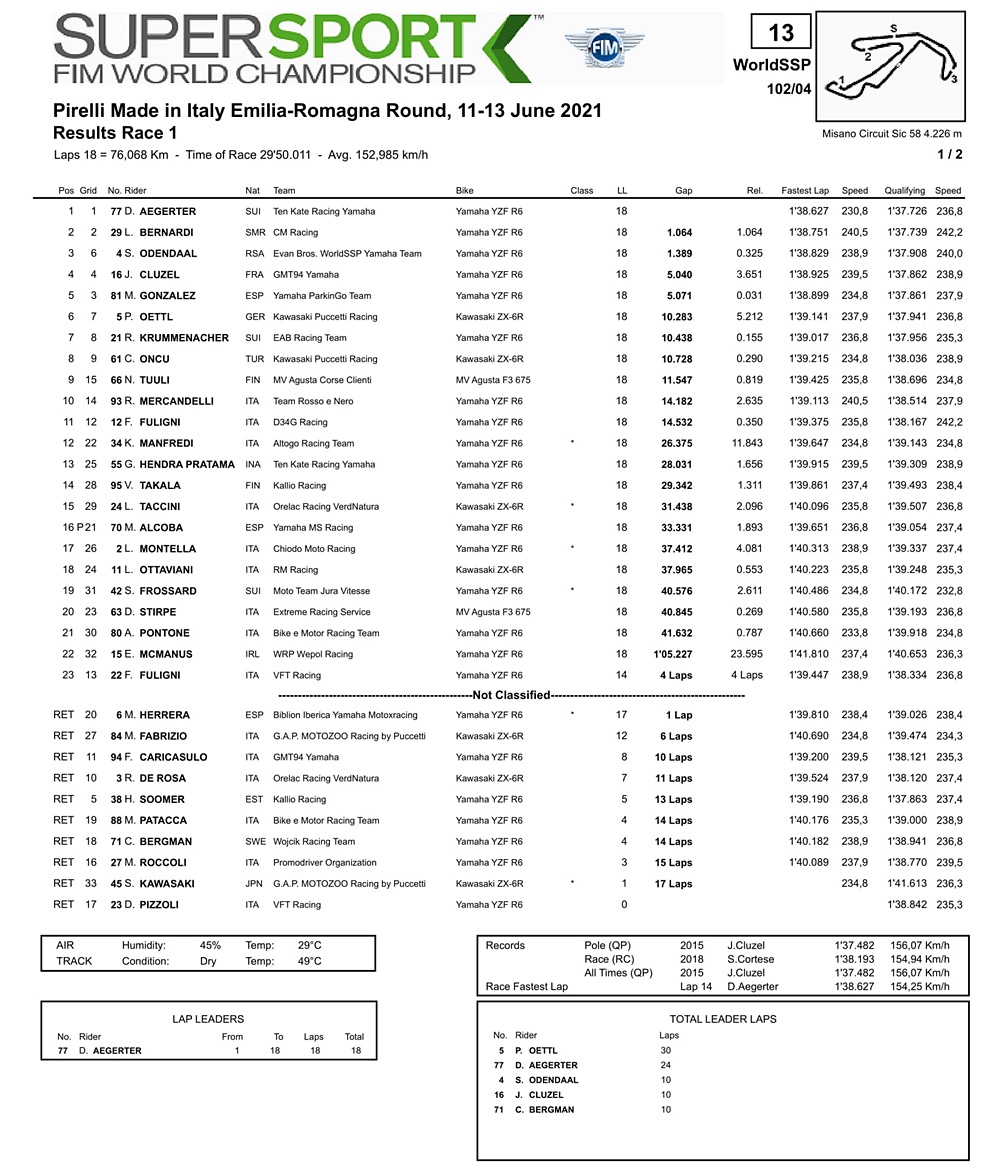 Dominique Aegerter sendiri akhirnya tetap menggapai garis finis terdepan. Ini jadi kemenangan keduanya setelah Race 2 di Estoril, Portugal. Gelar juara Aegerter semakin manis karena menjadi kemenangan ke-100 Yamaha dalam ajang WorldSSP.