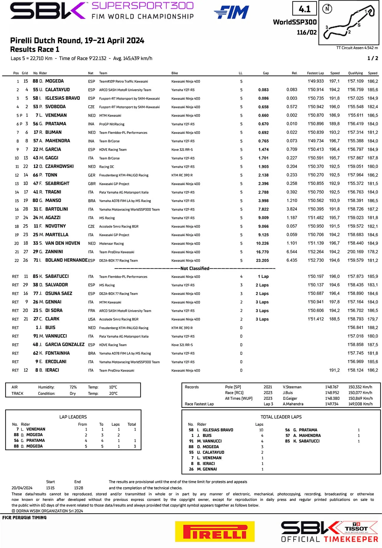 Lalu Galang Hendra mampu finish ke-6 dan ke-5 pada race 1 dan 2 WorldSSP300 Assen Belanda. Menariknya, kedua pembalap perwakilan Indonesia ini sempat mampu memimpin jalannya balapan, meskipun akhirnya gagal podium.