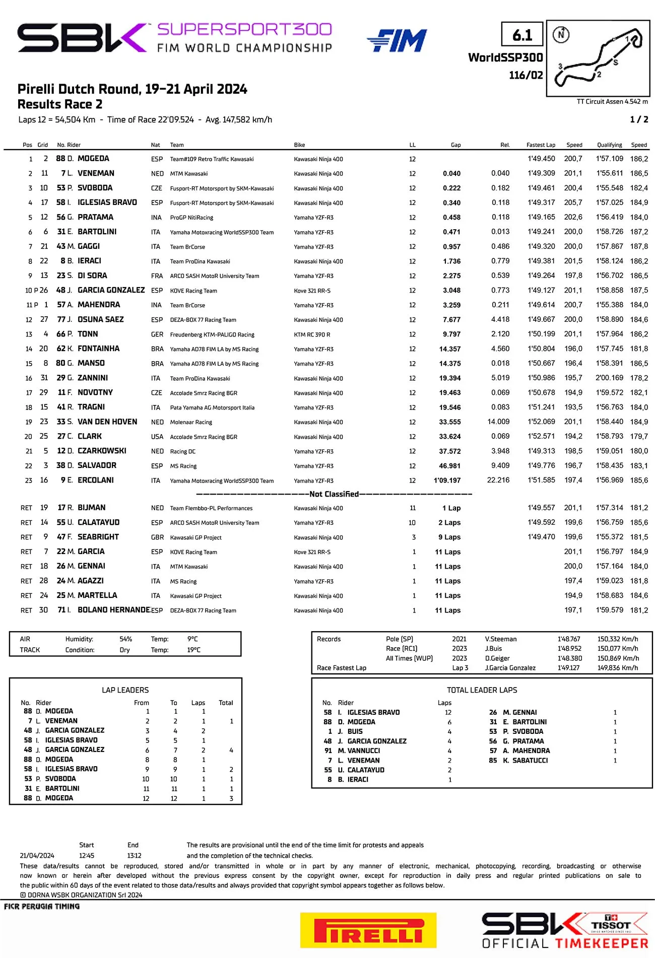Dari hasil ronde kedua di TT Assen ini, Aldi Satya Mahendra akhirnya menduduki posisi kelima klasemen sementara dengan 41 poin. Aldi berbeda 20 poin dari pimpinan klasemen sementara. Lalu Galang sendiri menduduki posisi ke-8 klasemen sementara dengan 30 poin.