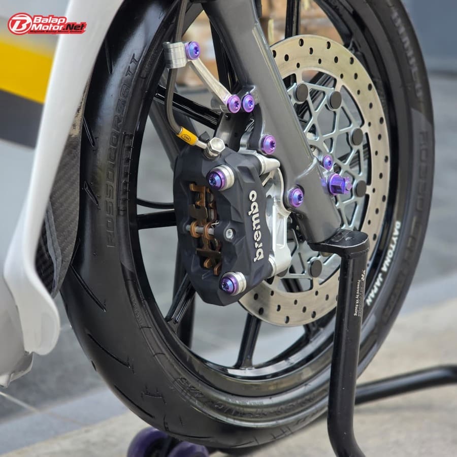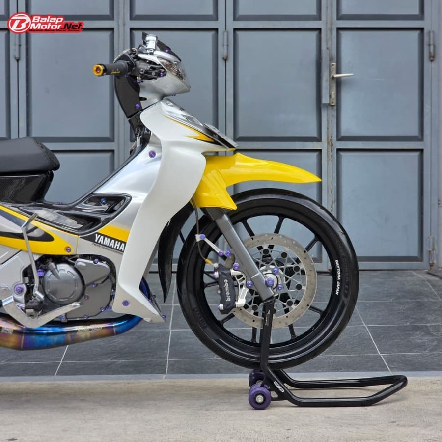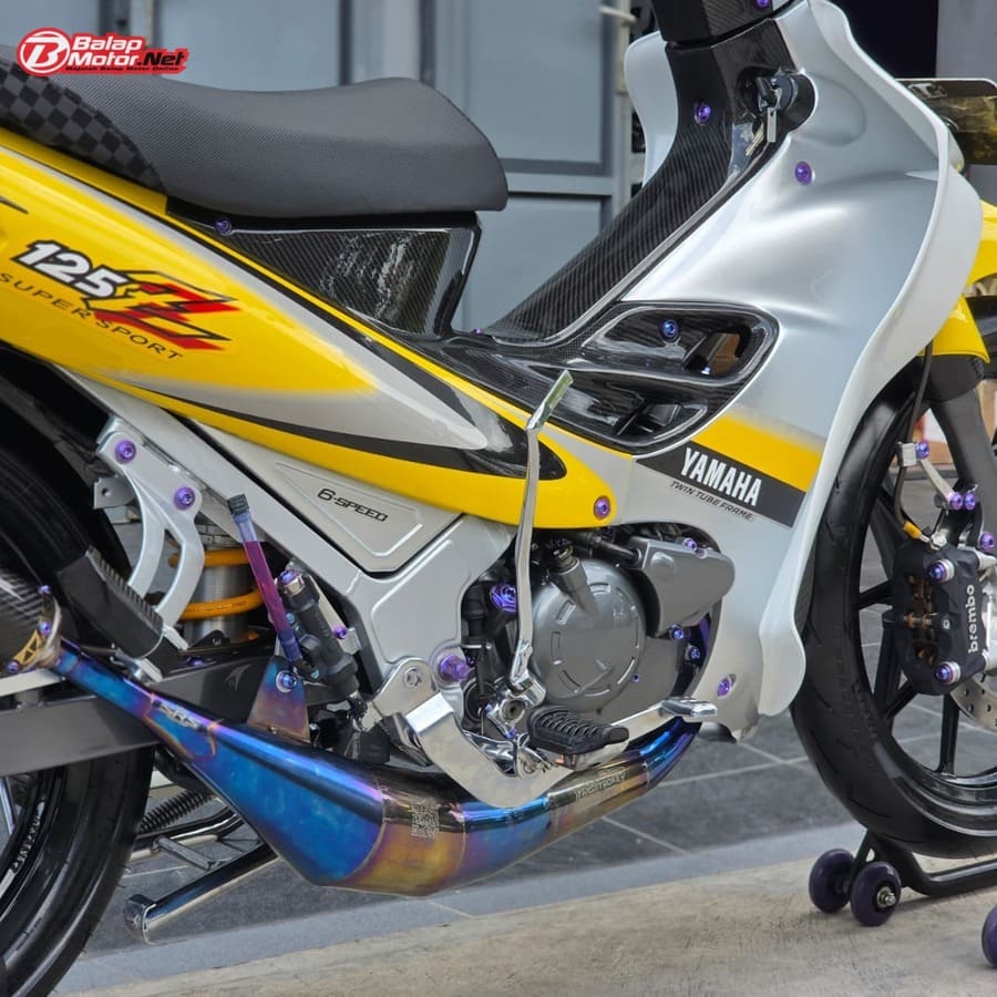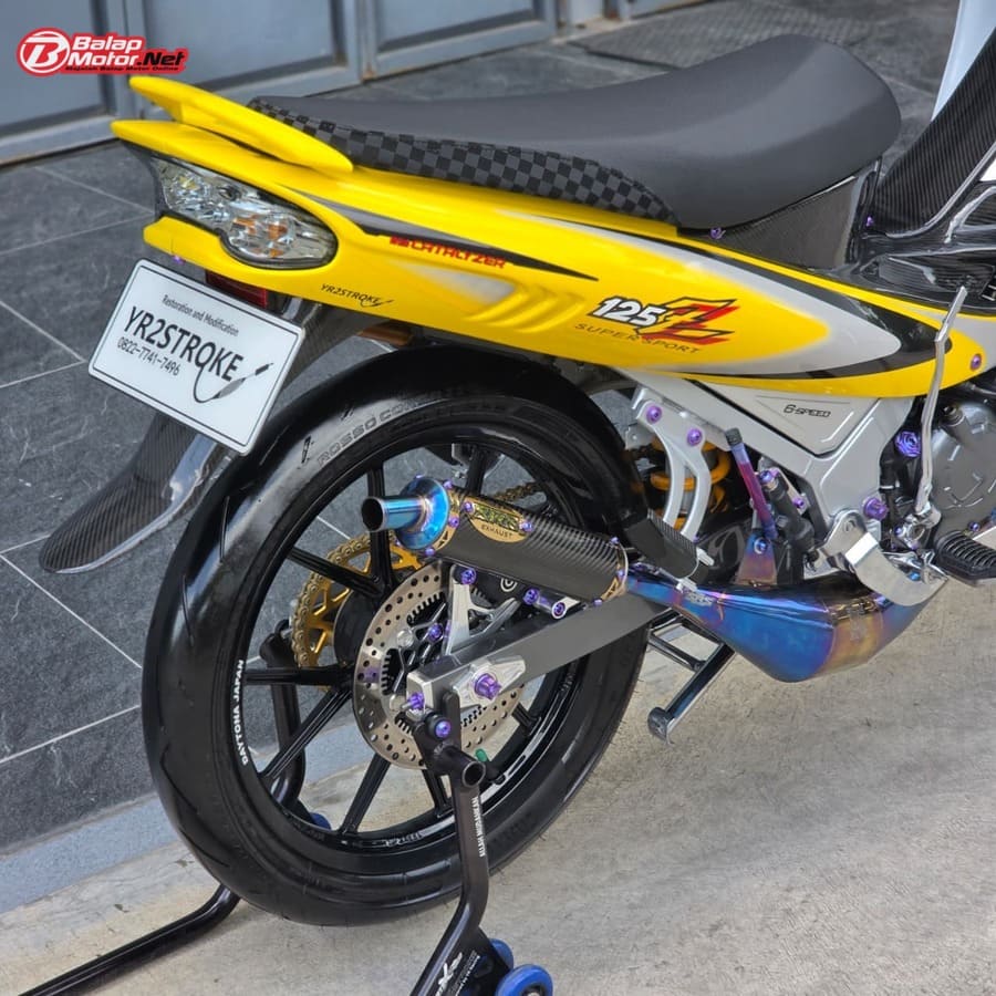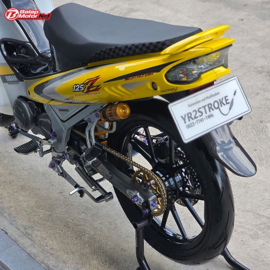 Masuk ke sektor teknis, spesifikasi Yamaha 125Z ini terbilang kelas atas. Mesin menggunakan blok OS 100 Seri Y Japan dengan sentuhan porting polish, dipadukan chamber SRS bluemoon titanium color serta detail silikon SRS carbon dan baut titanium. Kaki-kaki juga tak main-main, mulai dari velg Daytona GP Wheel Japan original, shock belakang Öhlins original, hingga sistem pengereman premium seperti kaliper Brembo radial monobloc M4 P32 di depan dan Brembo axial 2P di belakang, lengkap dengan piringan floating Mutakin 300 mm.