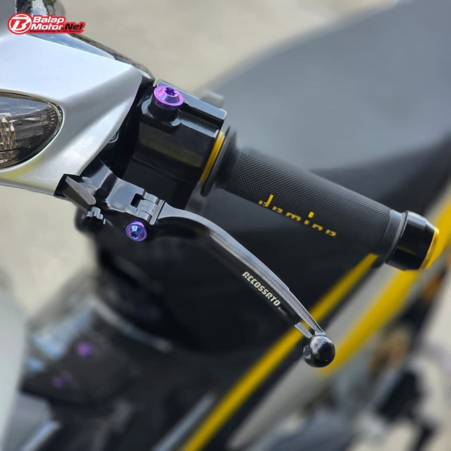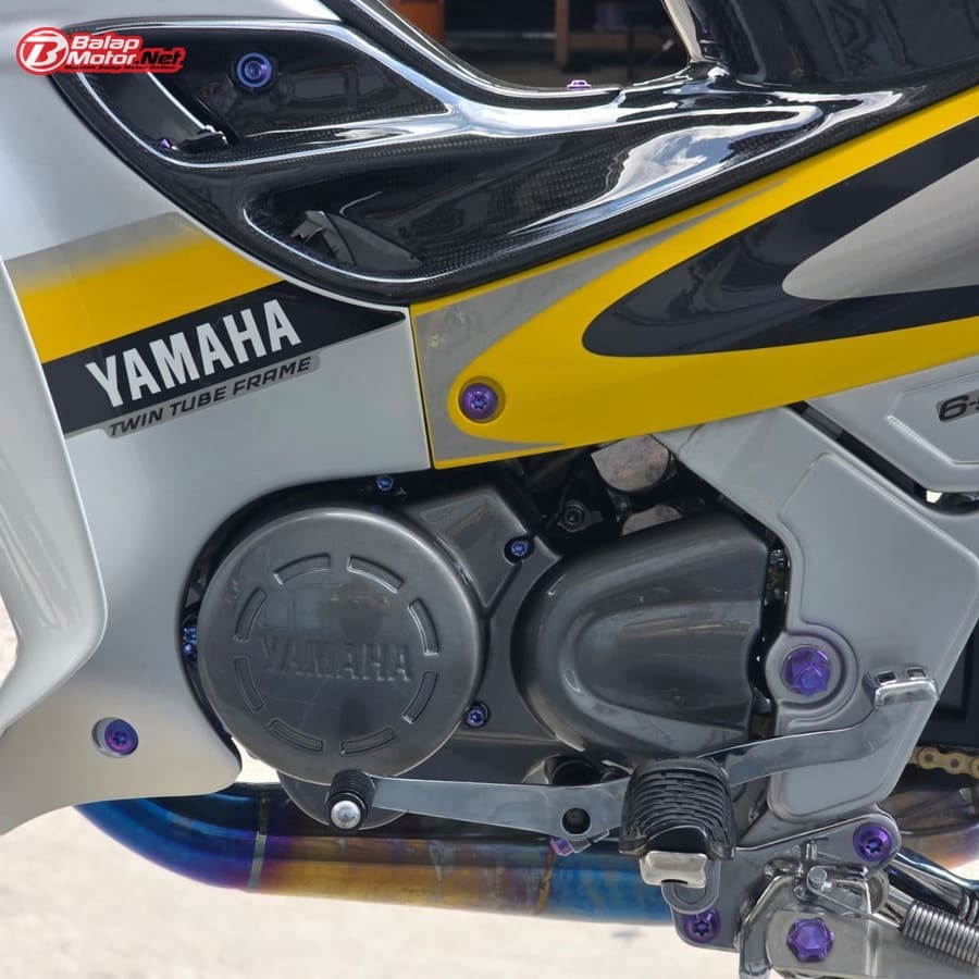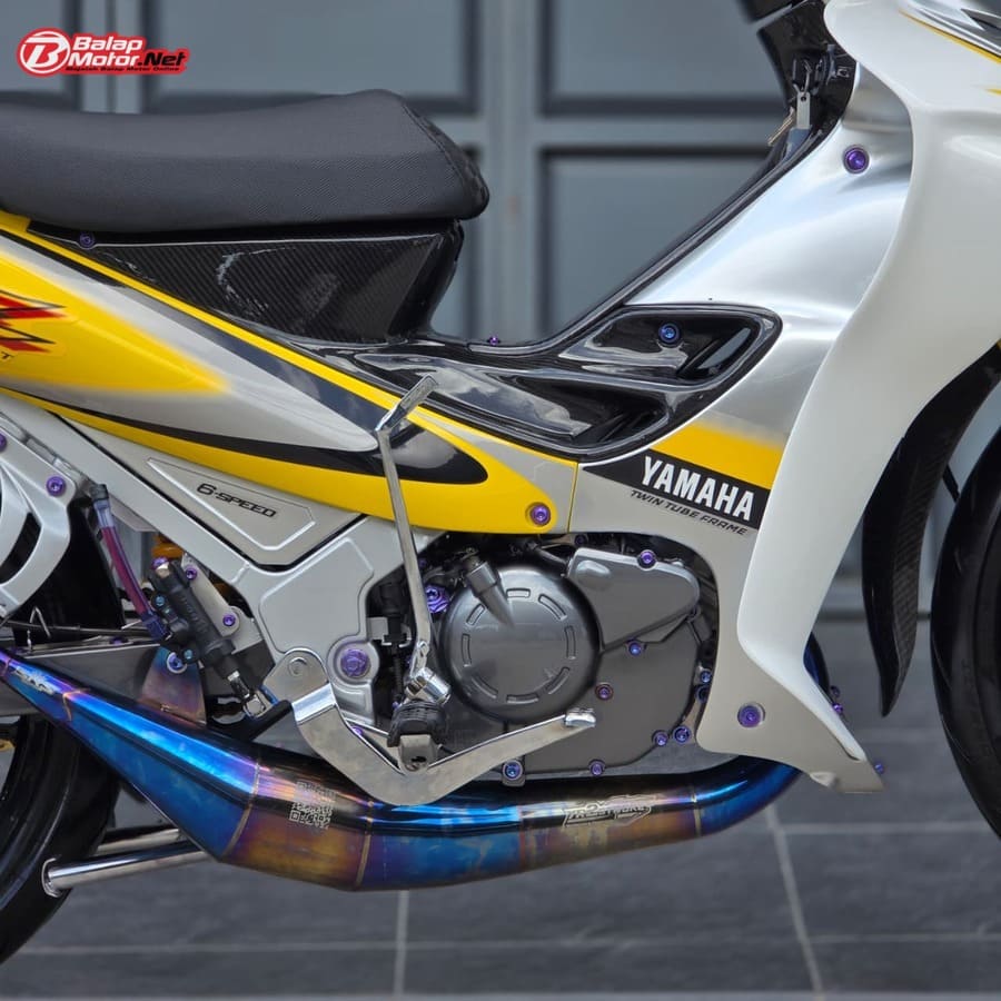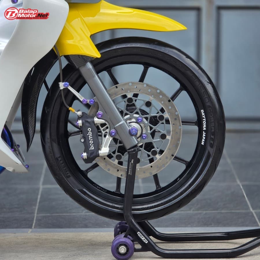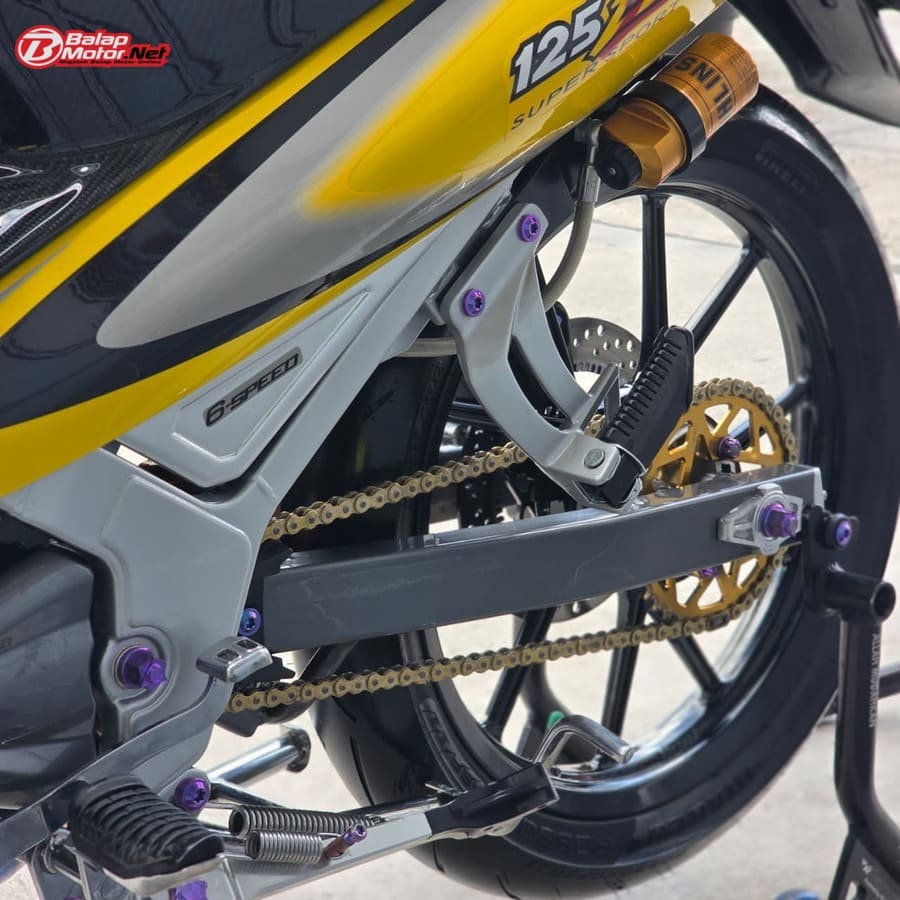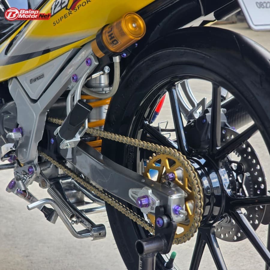 Masuk ke sektor teknis, spesifikasi Yamaha 125Z ini terbilang kelas atas. Mesin menggunakan blok OS 100 Seri Y Japan dengan sentuhan porting polish, dipadukan chamber SRS bluemoon titanium color serta detail silikon SRS carbon dan baut titanium. Kaki-kaki juga tak main-main, mulai dari velg Daytona GP Wheel Japan original, shock belakang Öhlins original, hingga sistem pengereman premium seperti kaliper Brembo radial monobloc M4 P32 di depan dan Brembo axial 2P di belakang, lengkap dengan piringan floating Mutakin 300 mm.
