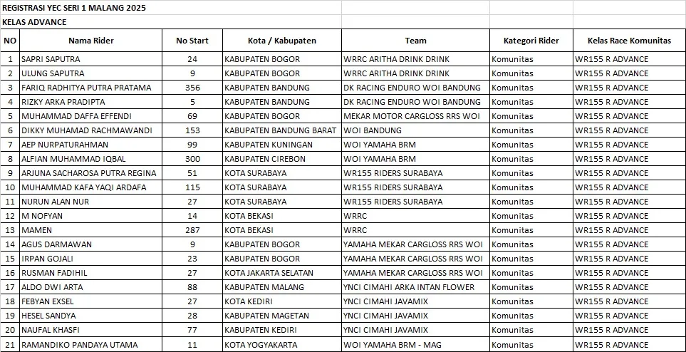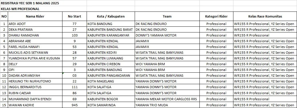 Di kategori WR Profesional, tercatat ada 15 rider papan atas dari berbagai daerah yang siap unjuk kemampuan di medan berat khas enduro. Di antaranya: