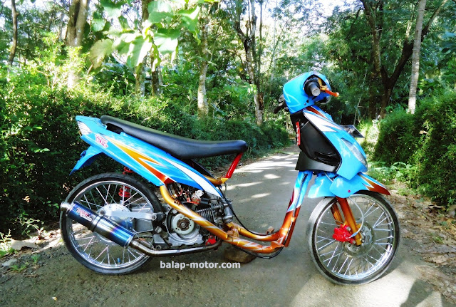 Lari sudah lumayan kenceng kalo tampang pas-pasan atau standaran ya sama aja bohong kan, maka dari itu bro Kukun langsung ambil body-body ke tukang cat tembok, eh tukang air beras wkwkwk salah terus nih . Maksudnya Airbrush bray, dia kali ini mempercayakan ke ahlinya Jayenk Paint di Rawalo, Banyumas. Dengan motif sederhana berwarna dasar biru ditambah garis-garis tajam membuat kesan ganten dan cepat lebih terlihat. Tidak cuma cat yang di ubah namun kaki-kaki juga dibikin gaya. Pelek standar diganti model ring 17 yang lagi marak di kawasan Banyumasan, lalu dibalut ban Comet 50/90-17 depan dan IRC Eat My Dust 60/80 buat mengahntarkan tenaga mesinya biar ga slide. Mantap juga nih, Sekarang sudah kaga sering telat lagi nih berangkat ke sekolahnya. Tinggal tingkatkan prestasinya dan jangan buat balap liaran yah bro, bahaya. DL
