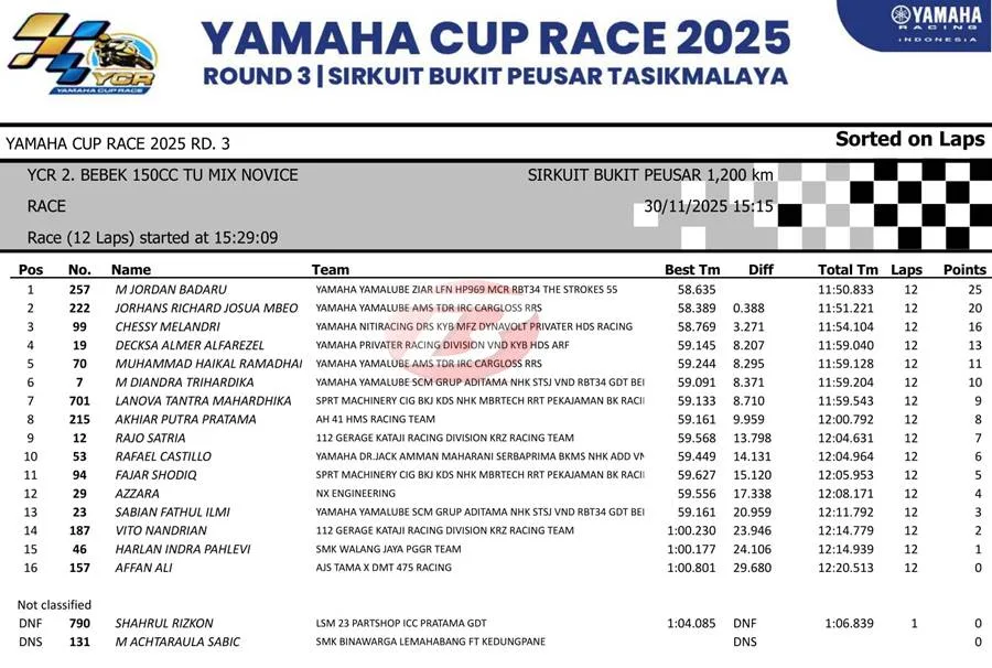 ‎BalapMotor.Net – Race Bebek 4T TU 150cc Novice pada event Yamaha Cup Race (YCR) di sirkuit Bukit Peusar, Tasikmalaya berlangsung begitu seru dan menarik.