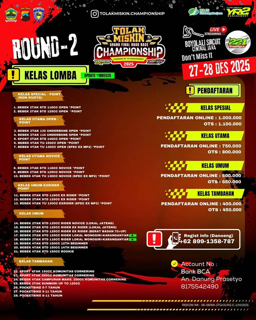 BalapMotor.Net – Berstatus sebagai tuan rumah, YR Tolak Miskin Racing Team memastikan tampil dengan kekuatan penuh pada gelaran Tolak Miskin Championship yang akan berlangsung di Sirkuit Gokart Boyolali, Jawa Tengah, pada 27–28 Desember 2025.