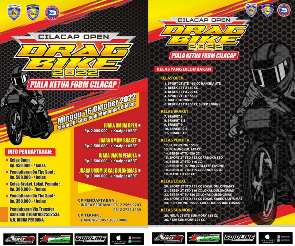 BalapMotor.Net – Bagi pecinta adu kebut 201m, jangan sampai terlewatkan nih gelaran Cilacap Open Drag Bike 2022 yang akan berlangsung di sirkuit NP. Jl. Setia Budi, Muhandas, Cilacap, Jateng.