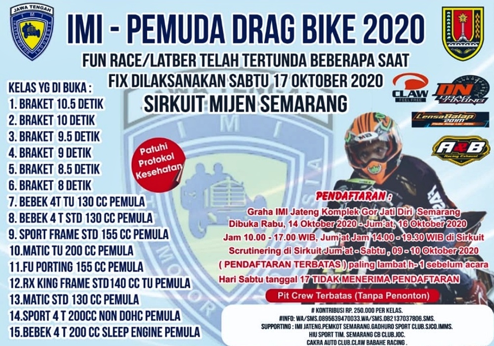 BalapMotor.Net – Kabar sedap bagi pecinta balap lurus (drag bike) di wilayah Semarang dan sekitarnya. Sabtu besok, 17 Oktober 2020 akan disajikan latber/funrace di sirkuit Mijen.